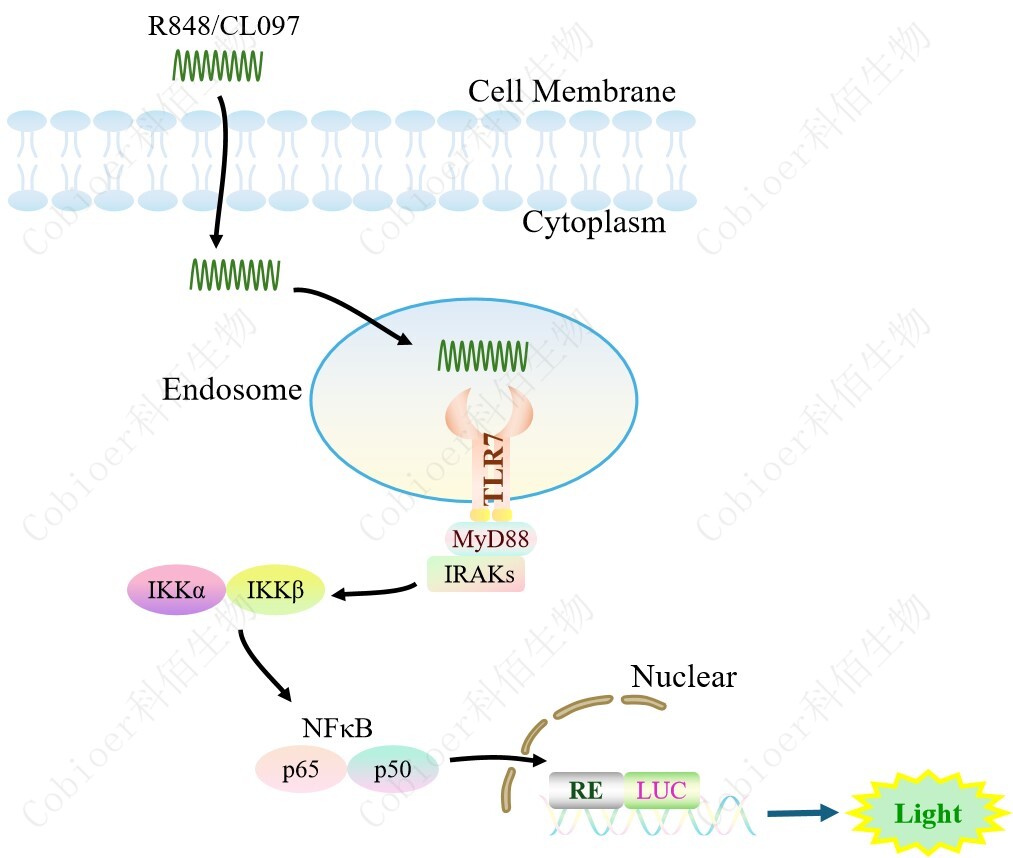TLR7 NFκB-Luc HEK293 報告基因藥靶模型很好的模擬了體內(nèi) TLR7 的信號轉(zhuǎn)導(dǎo)過程, 原理見下圖所示。