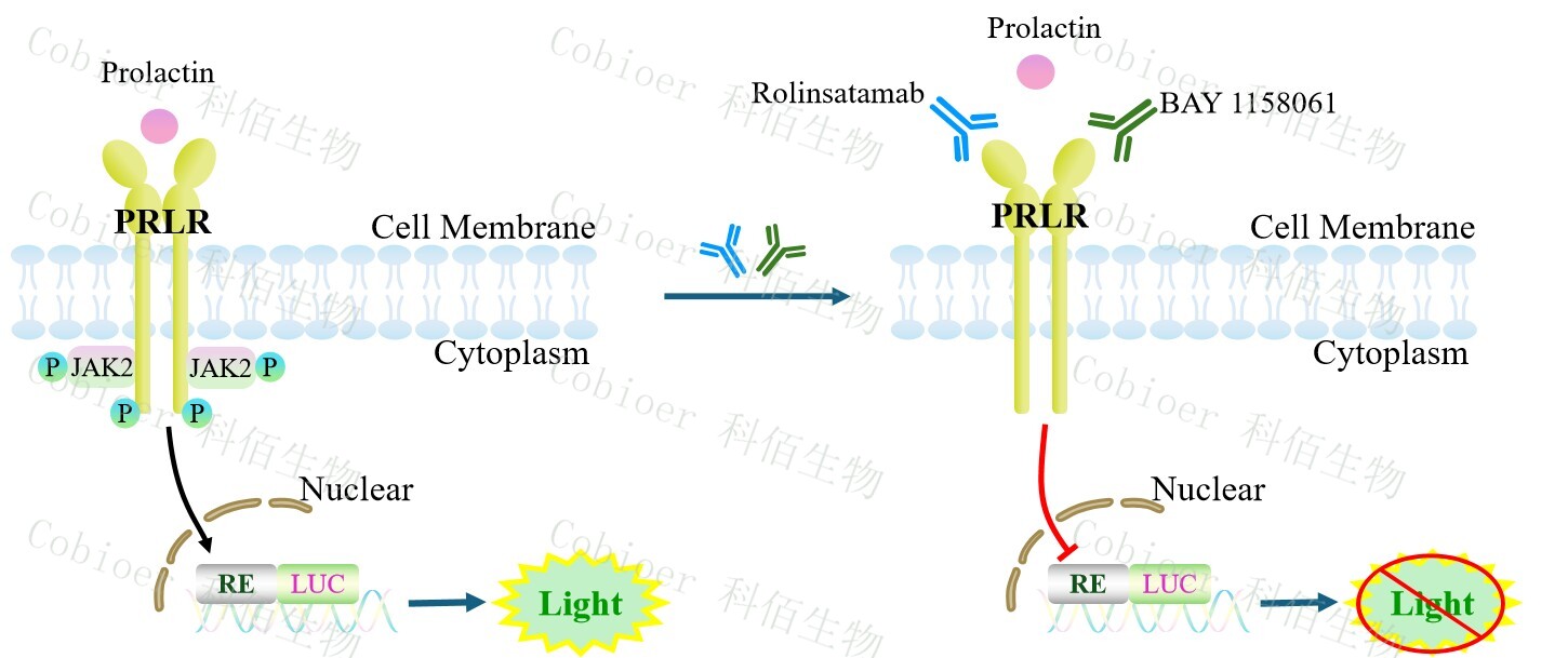 PRL Effector Reporter Cell 報(bào)告基因藥靶模型很好的模擬了體內(nèi) PRL 的信號(hào)轉(zhuǎn)導(dǎo)過(guò)程, 原理見下圖所示。![]() Figure 1. PRL Effector Reporter Cell 模型原理圖 |