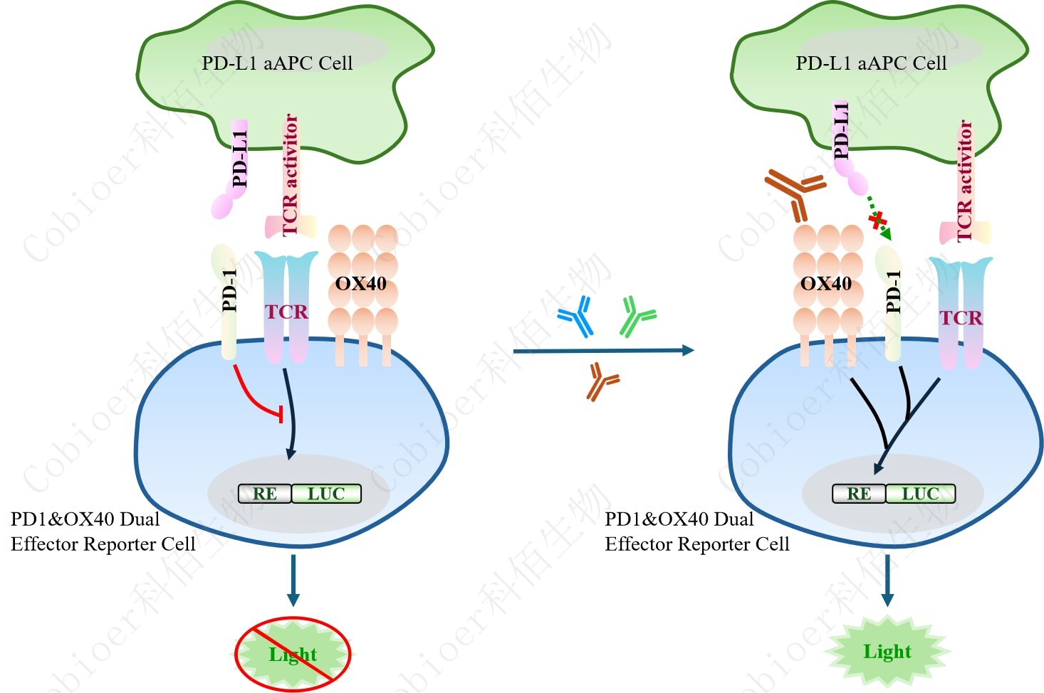 PD1&OX40 Dual Effector Reporter Cell 報告基因藥靶模型很好的模擬了體內(nèi) PD1&OX40 的信號轉(zhuǎn)導過程,原理見下圖所示。