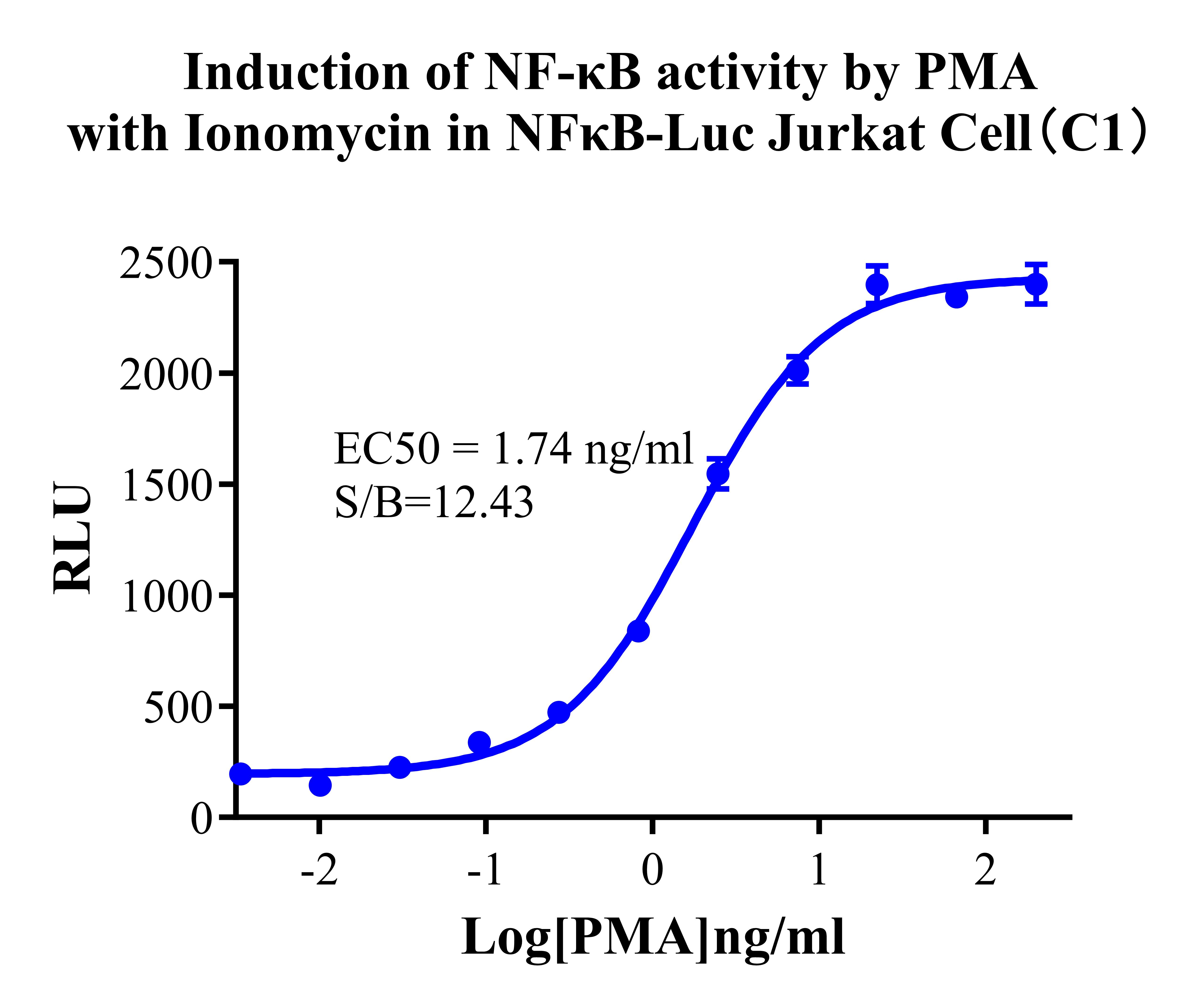 NFκB-Luc Jurkat 報(bào)告基因細(xì)胞是由 NFκB 調(diào)控并表達(dá) Luc 熒光素酶報(bào) 告基因的 Jurkat細(xì)胞。PMA 是 DAG(二酯酰甘油)的類似物,可自由的通過(guò)細(xì)胞膜,直接 作用于細(xì)胞活化信號(hào)轉(zhuǎn)導(dǎo)通路上的 PKC,原理見(jiàn)下圖所示。![]() Figure 1:NFκB-Luc Jurkat 細(xì)胞模型原理圖