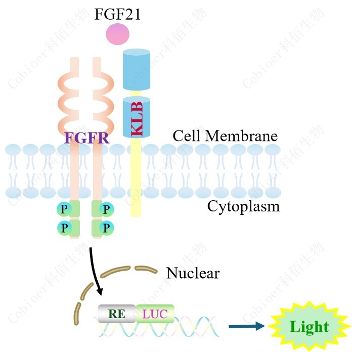 KLB Effector Reporter Cell 報(bào)告基因藥靶模型很好的模擬了體內(nèi) KLB 的信號(hào)轉(zhuǎn)導(dǎo)過(guò)程, 原理見(jiàn)下圖所示。 ![]() Figure 1. KLB Effector Reporter Cell 細(xì)胞模型原理圖