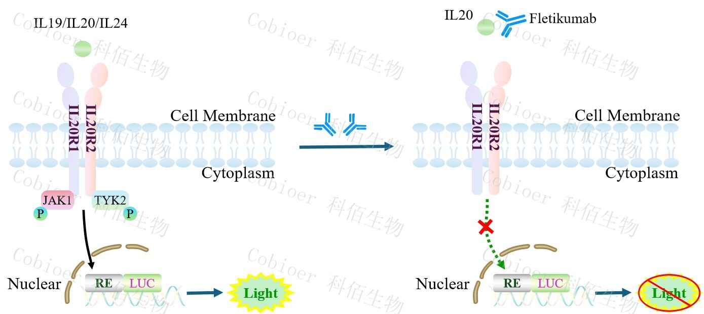 hIL19/IL20/IL24 Triple Effector Reporter Cell 報告基因藥靶模型很好的模擬了體內(nèi)IL19/IL20/IL24 的信號轉(zhuǎn)導(dǎo)過程,原理見下圖所示。