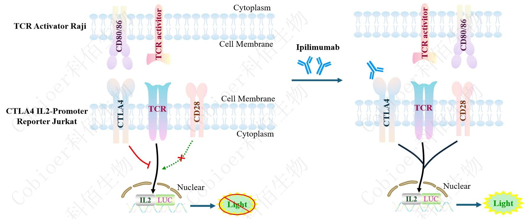 CTLA4 IL2-Promoter Reporter Jurkat 報(bào)告基因藥靶模型很好的模擬了體內(nèi) CTLA4&IL2 的信號(hào)轉(zhuǎn)導(dǎo)過程,原理見下圖所示。![]() Figure 1. CTLA4 IL2-Promoter Reporter Jurkat 細(xì)胞模型原理圖 |
