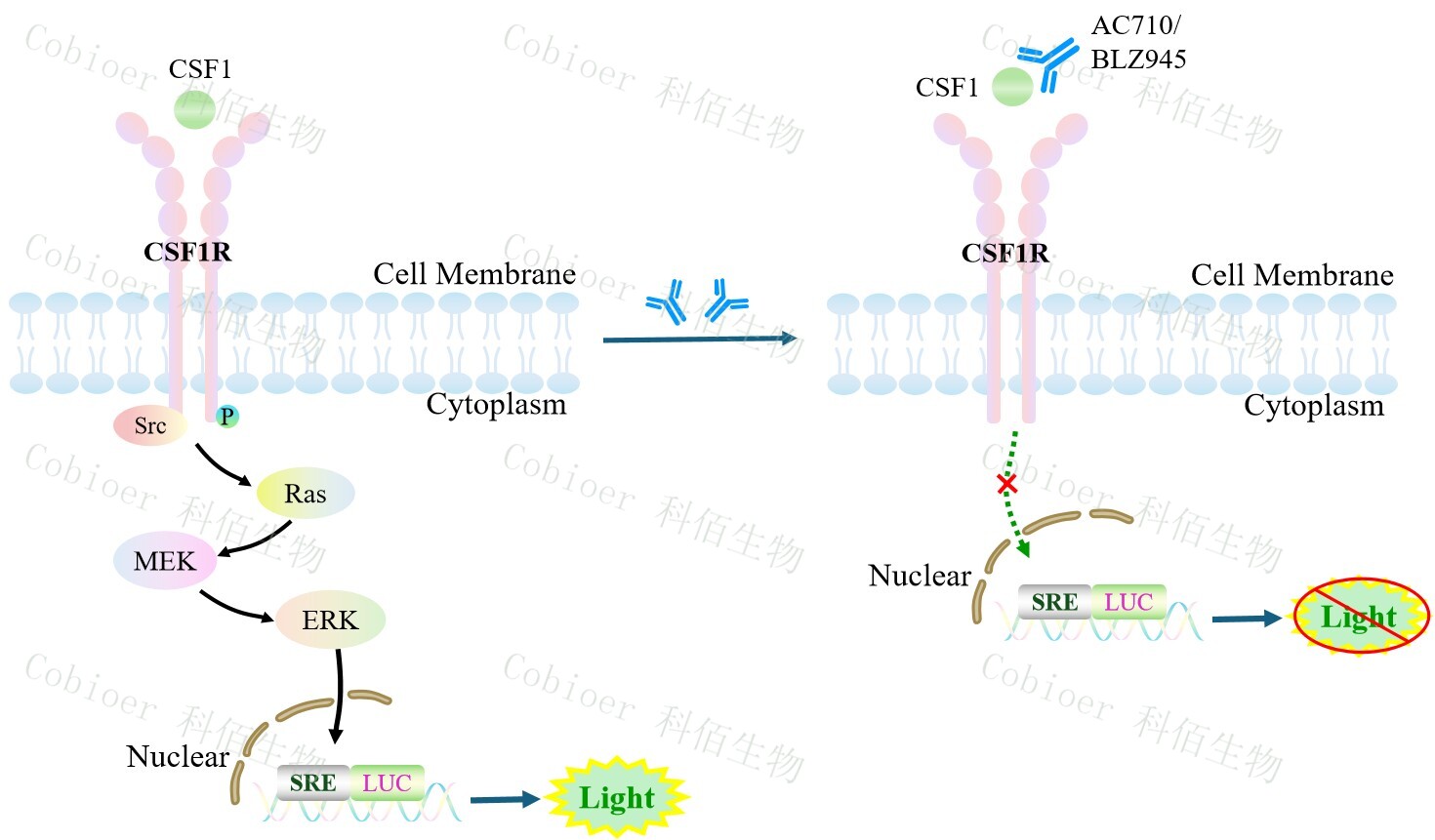 CSF1R SRE-Luc HEK293 報告基因藥靶模型很好的模擬了體內 CSF1 的信號轉導過程, 原理見下圖所示。