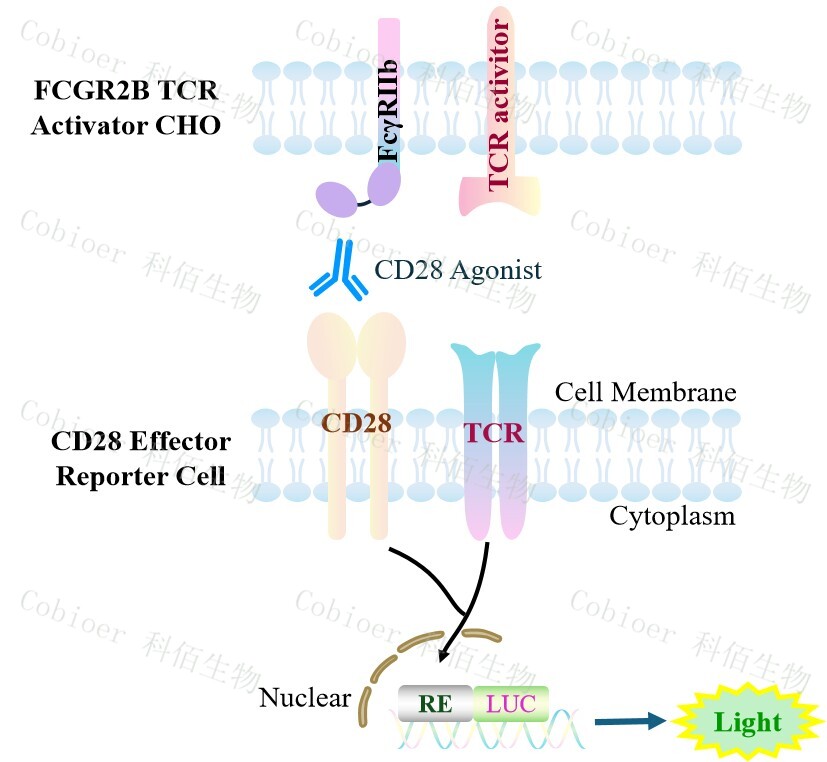 CD28 Effector Reporter Cell 報告基因藥靶模型很好的模擬了體內(nèi) CD28 的信號轉(zhuǎn)導(dǎo)過 程,原理見下圖所示。 ![]() Figure 1. CD28 Effector Reporter Cell 細胞模型原理圖 |