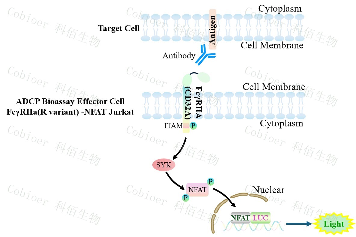 ADCP Bioassay Effector Cell FcγRIIa(R variant) -NFAT Jurkat 報(bào)告基因藥靶模型很好的 模擬了體內(nèi) ADCP 的信號(hào)轉(zhuǎn)導(dǎo)過程,原理見下圖所示。