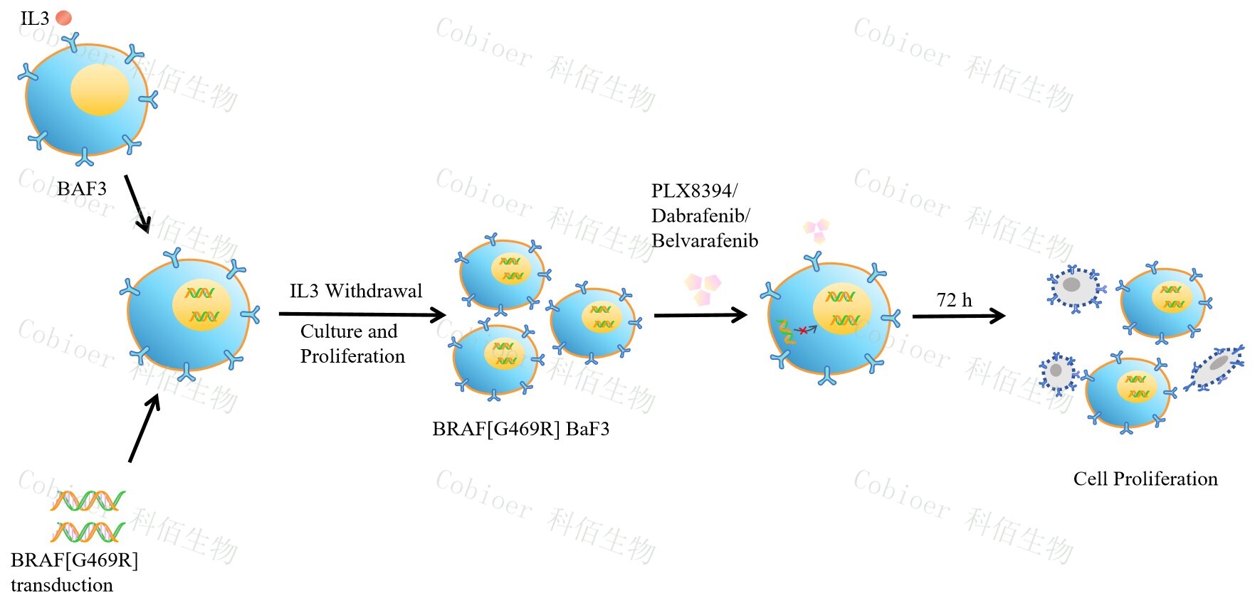 BaF3(小鼠原 B 細(xì)胞)的生長(zhǎng)和增殖需要 IL-3 的維持。通過(guò)引入各種表達(dá)激酶的基因, 能作為 BaF3 的驅(qū)動(dòng)基因,讓 BaF3 不再依賴 IL-3 而增殖,進(jìn)而激酶基因成為 BaF3 增殖依 賴的驅(qū)動(dòng)基因,用于評(píng)估小分子藥物對(duì)激酶的靶向抑制作用,原理及流程見下圖所示。 ![]() Figure 1. BRAF[G469R] BaF3 細(xì)胞的構(gòu)建原理圖 |