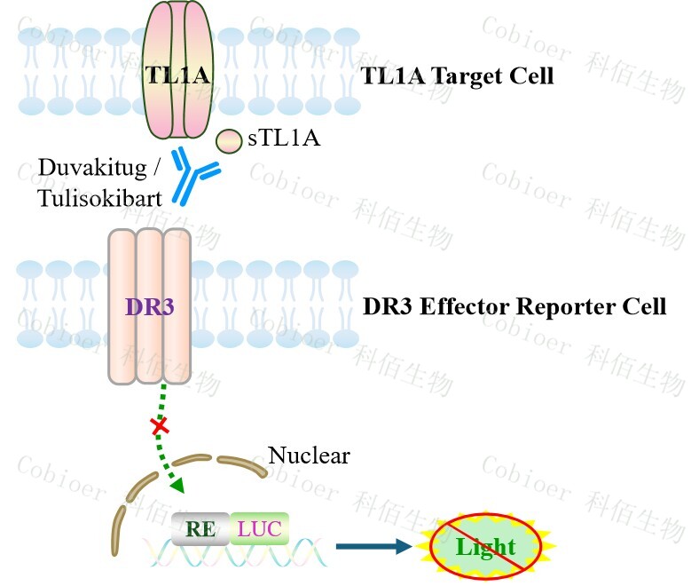 TL1A Target Cell 作為 DR3 Effector Reporter Cell 的靶細(xì)胞,很好的模擬了體內(nèi) DR3 的 信號(hào)轉(zhuǎn)導(dǎo)過程,原理見下圖所示。