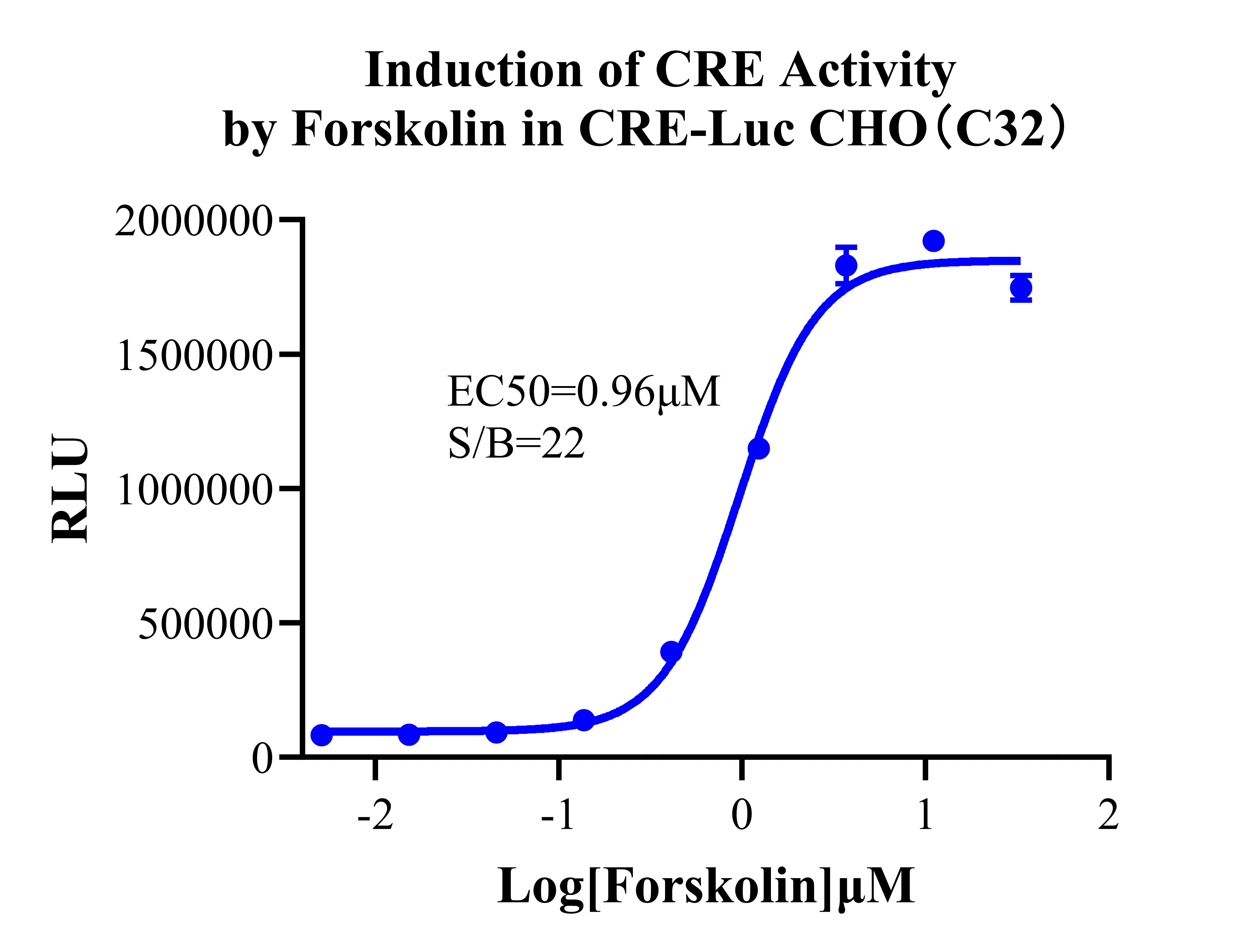 CRE-Luc CHO 報(bào)告基因細(xì)胞,是由 CRE 調(diào)控并表達(dá) Luc 熒光素酶報(bào)告 基因的 CHO 細(xì)胞。Forskolin 是天然存在的直接腺苷酸環(huán)化酶(AC)/cAMP/CREB 的激活 劑,原理見下圖所示。