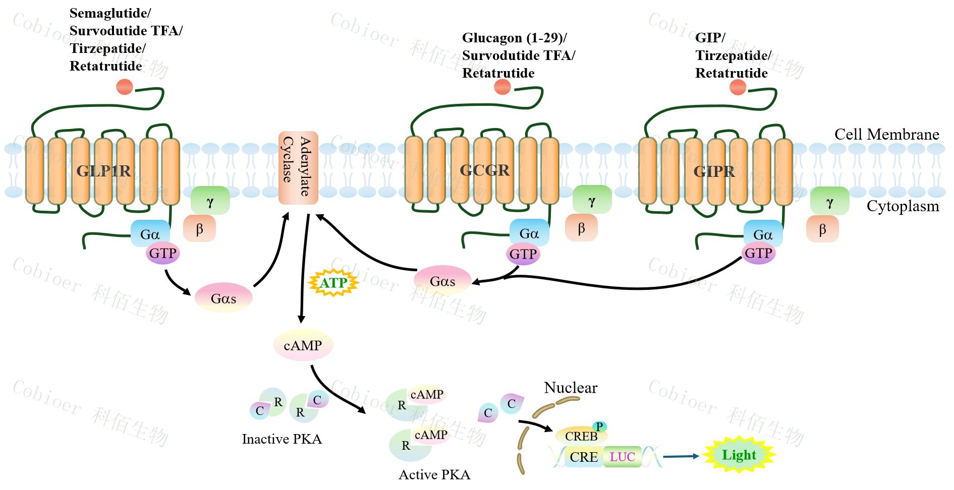 GLP1R&GCGR&GIPR Triple Reporter Cell 報(bào)告基因藥靶模型很好的模擬了體內(nèi)GLP1R&GCGR&GIPR 的信號(hào)轉(zhuǎn)導(dǎo)過程,原理見圖1 所