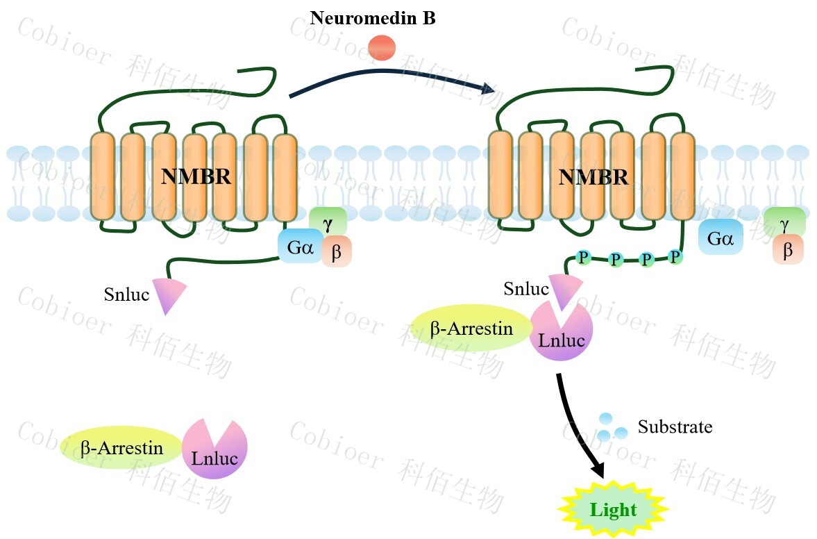 NMBR(BB1) β-Arrestin CHO 報告基因藥靶模型很好的模擬了體內 NMBR/β-Arrestin 的信號轉導過程,原理見下圖所示。當缺乏配體刺激時,β-Arrestin 不與 NMBR 結合,融合β- Arrestin 的熒光素酶處于失活構象,當 NMBR 遭遇配體刺激時,融合熒光素酶報告基因的 β-Arrestin 被招募,使熒光素酶報告基因處于激活狀態(tài),加入其底物后發(fā)光信號增強。![]() Figure 1. NMBR(BB1) β-Arrestin CHO 細胞模型原理圖 |