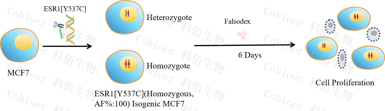ESR1[Y537C](Homozygous,AF%:100) Isogenic MCF7 藥靶細(xì)胞,通過(guò)基因編輯的方式將 ESR1 的 537 位氨基酸酪氨酸(Y)突變?yōu)榘腚装彼幔–)。![]() Figure 1. ESR1[Y537C](Homozygous,AF%:100) Isogenic MCF7 原理示意圖 |