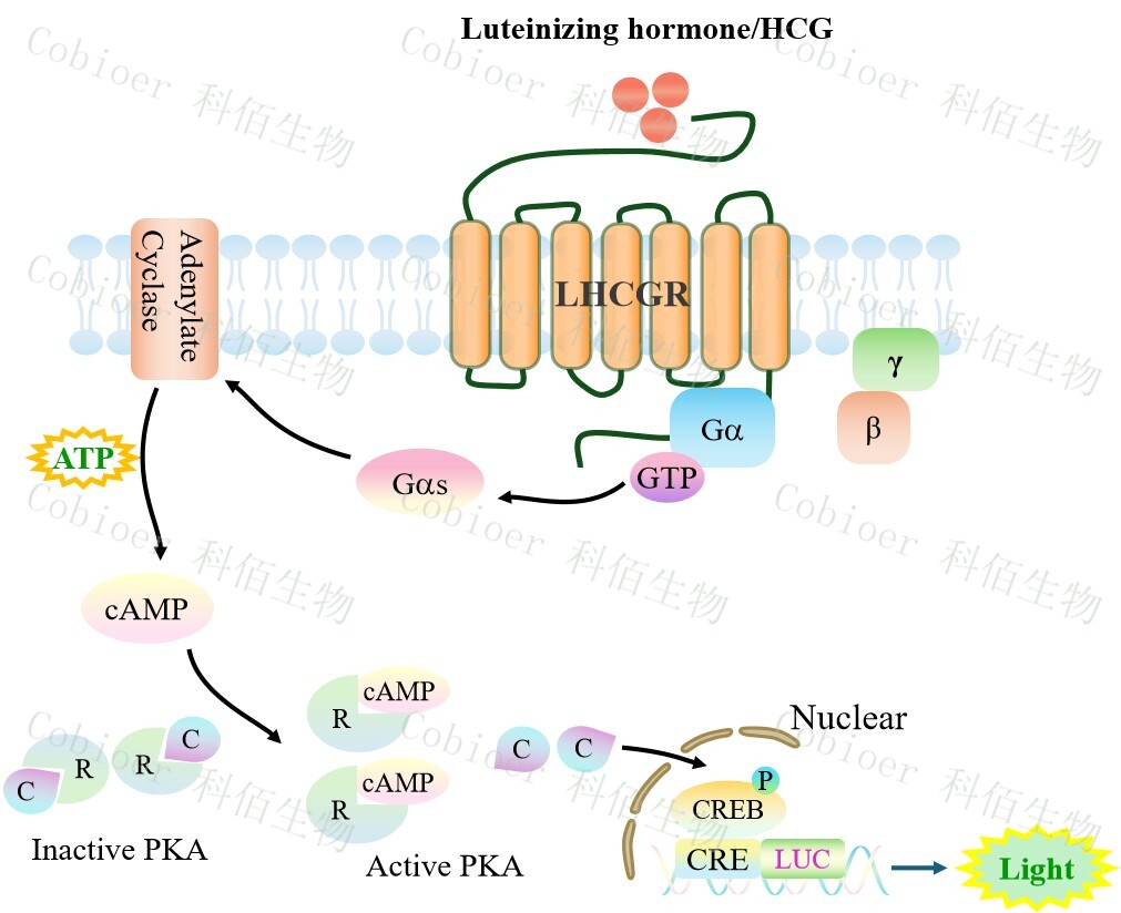 LHCGR CRE-Luc HEK293 報(bào)告基因藥靶模型很好的模擬了體內(nèi) LHCGR 的信號(hào)轉(zhuǎn)導(dǎo)過(guò)程,原理見(jiàn)下圖所示。![]() Figure 1. LHCGR CRE-Luc HEK293 細(xì)胞模型原理圖 |