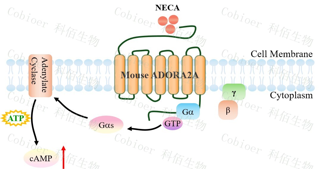 cAMP 在 G 蛋白偶聯(lián)受體(GPCR)信號轉導中是一種關鍵的第二信使。當配體結合 到 GPCR,構象發(fā)生變化,激活受體接著激活 G 蛋白,Gs 的激活導致腺苷酸環(huán)化酶調控 cAMP 的升高。