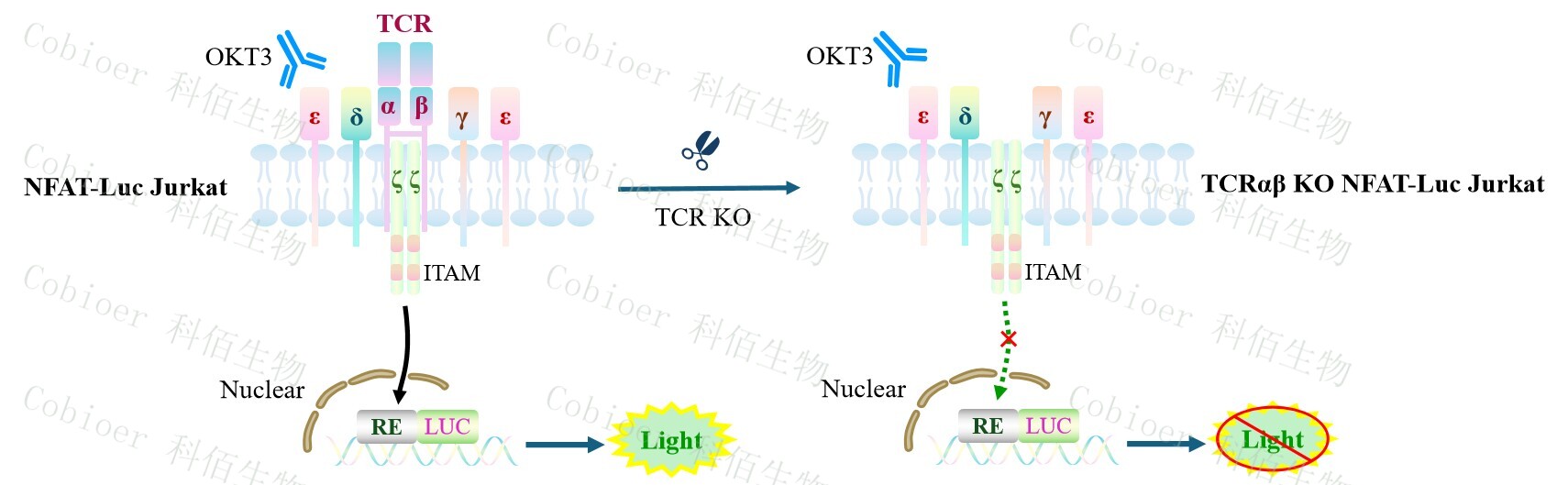 TCRαβ KO NFAT-Luc Jurkat 報告基因藥靶模型很好的模擬了體內 TCR 的信號轉導過程, 原理見下圖所示。![]() Figure 1. TCRαβ KO NFAT-Luc Jurkat 細胞模型原理圖 |