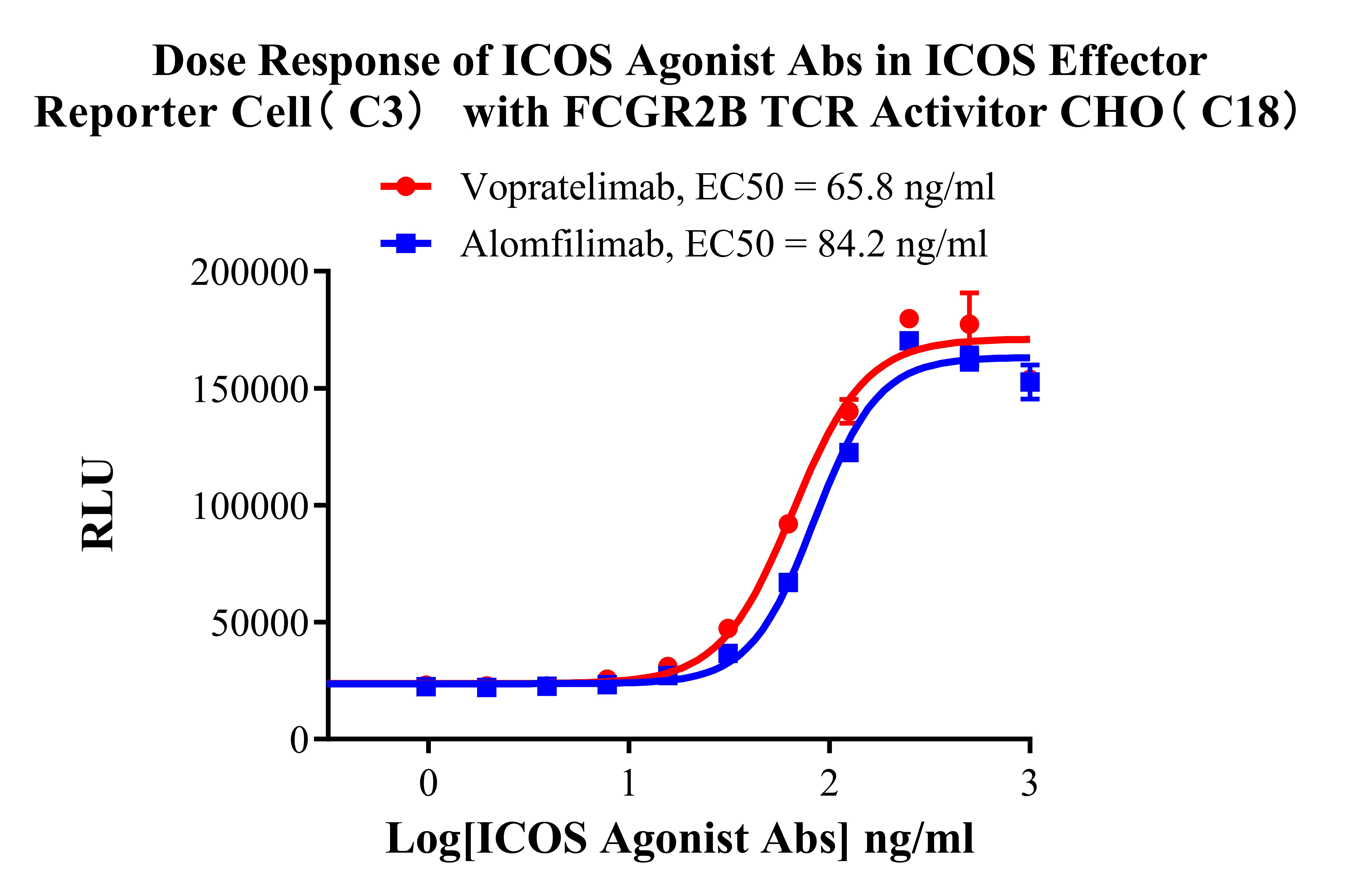 ![]() Figure 1. Dose Response of ICOS Agonist Abs in ICOS Effector Reporter Cell(C3) with FCGR2B TCR Activitor CHO(C18).