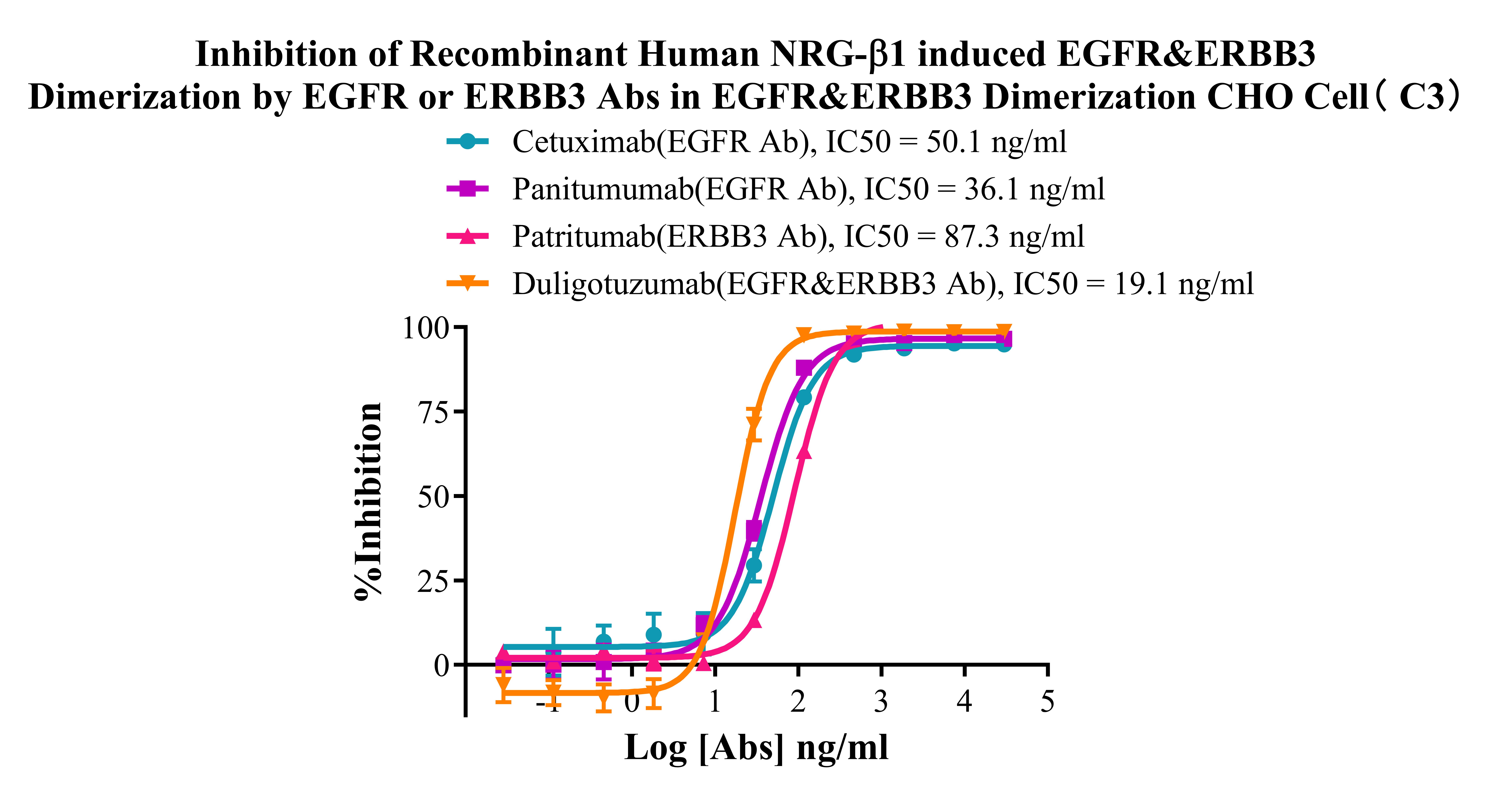 ![]() Figure 2. Inhibition of Recombinant Human NRG-β1 induced EGFR&ERBB3 Dimerization by EGFR or ERBB3 Abs in EGFR&ERBB3 Dimerization CHO Cell(C3). ![]() |