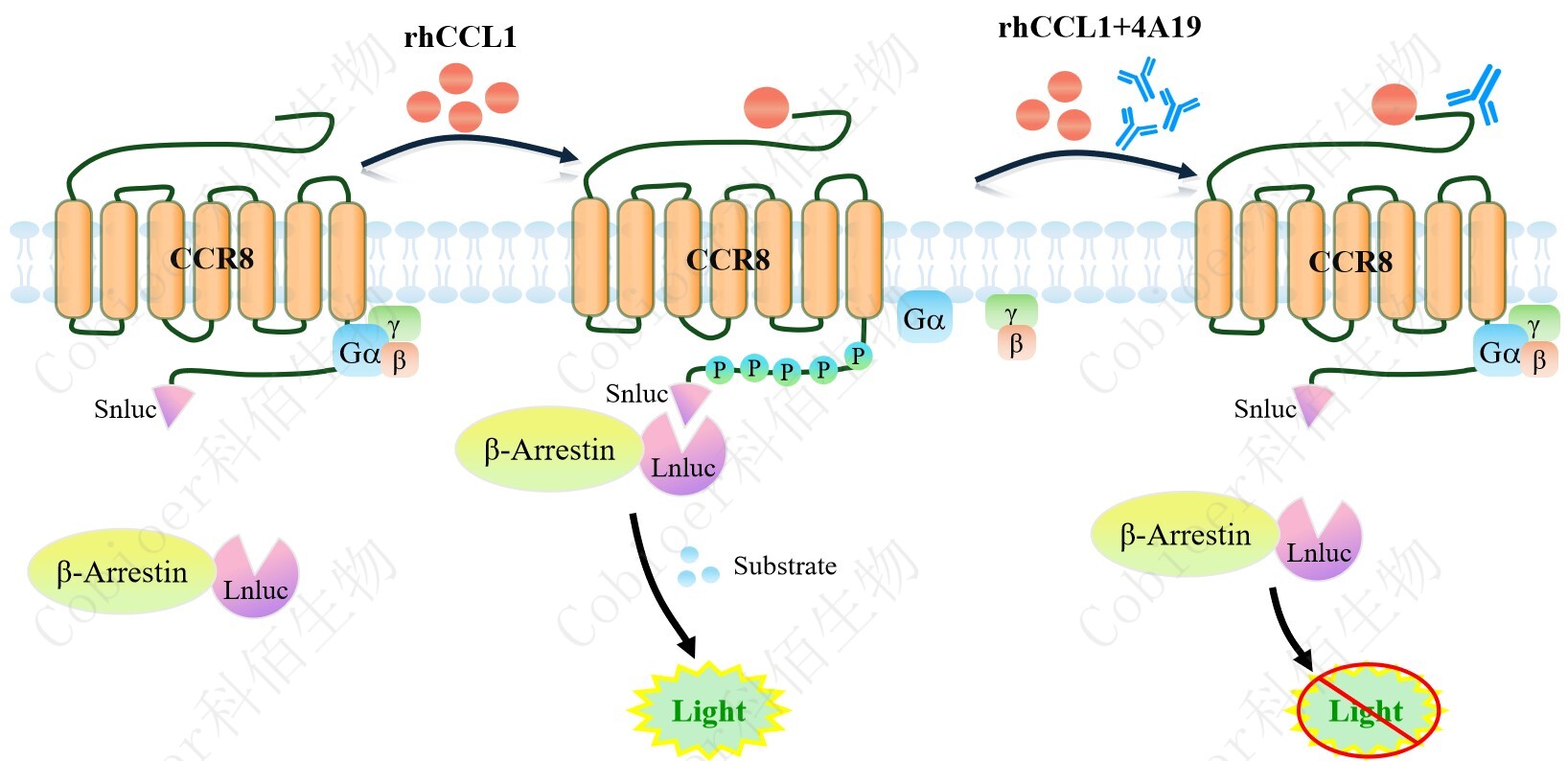 CCR8 β-Arrestin CHO 報告基因藥靶模型很好的模擬了體內(nèi) CCR8/β-Arrestin 的信號轉(zhuǎn)導(dǎo)過程,原理見下圖所示。當(dāng)缺乏配體刺激時,β-Arrestin 不與 CCR8 結(jié)合,融合β-Arrestin的熒光素酶處于失活構(gòu)象,當(dāng) CCR8 遭遇配體刺激時,融合熒光素酶報告基因的β-Arrestin被招募,使熒光素酶報告基因處于激活狀態(tài),加入其底物后發(fā)光信號增強(qiáng)。