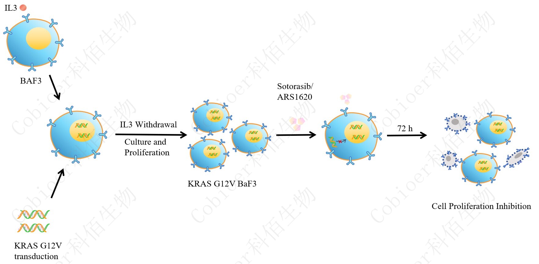 BaF3(小鼠原 B 細胞)的生長和增殖需要 IL-3 的維持。通過引入各種表達激酶的基因, 能作為 BaF3 的驅(qū)動基因,讓 BaF3 不再依賴 IL-3 而增殖,進而激酶基因成為 BaF3 增殖依賴的驅(qū)動基因,用于評估小分子藥物對激酶的靶向抑制作用,原理及流程見下圖所示。