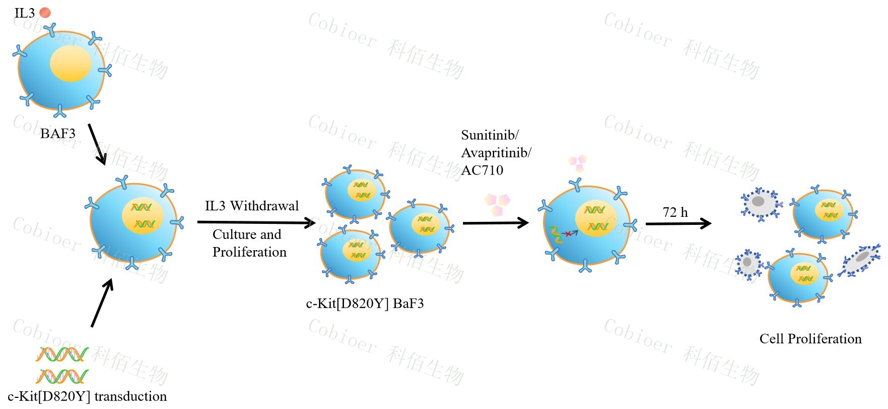| c-Kit[D820Y] BaF3 藥靶細(xì)胞,通過轉(zhuǎn)導(dǎo)突變狀態(tài)的 c-Kit[D820Y] 基因 到 BaF3 細(xì)胞系中,穩(wěn)定表達(dá)人突變形態(tài)下的 c-Kit[D820Y] 基因。 BaF3(小鼠原 B 細(xì)胞)的生長和增殖需要 IL-3 的維持。通過引入各種表達(dá)激酶的基因, 能作為 BaF3 的驅(qū)動(dòng)基因,讓 BaF3 不再依賴 IL-3 而增殖,進(jìn)而激酶基因成為 BaF3 增殖依賴的驅(qū)動(dòng)基因,用于評估小分子藥物對激酶的靶向抑制作用,原理及流程見下圖所示。 ![]() Figure 1. c-Kit [D820Y] BaF3 細(xì)胞的構(gòu)建原理圖 |
