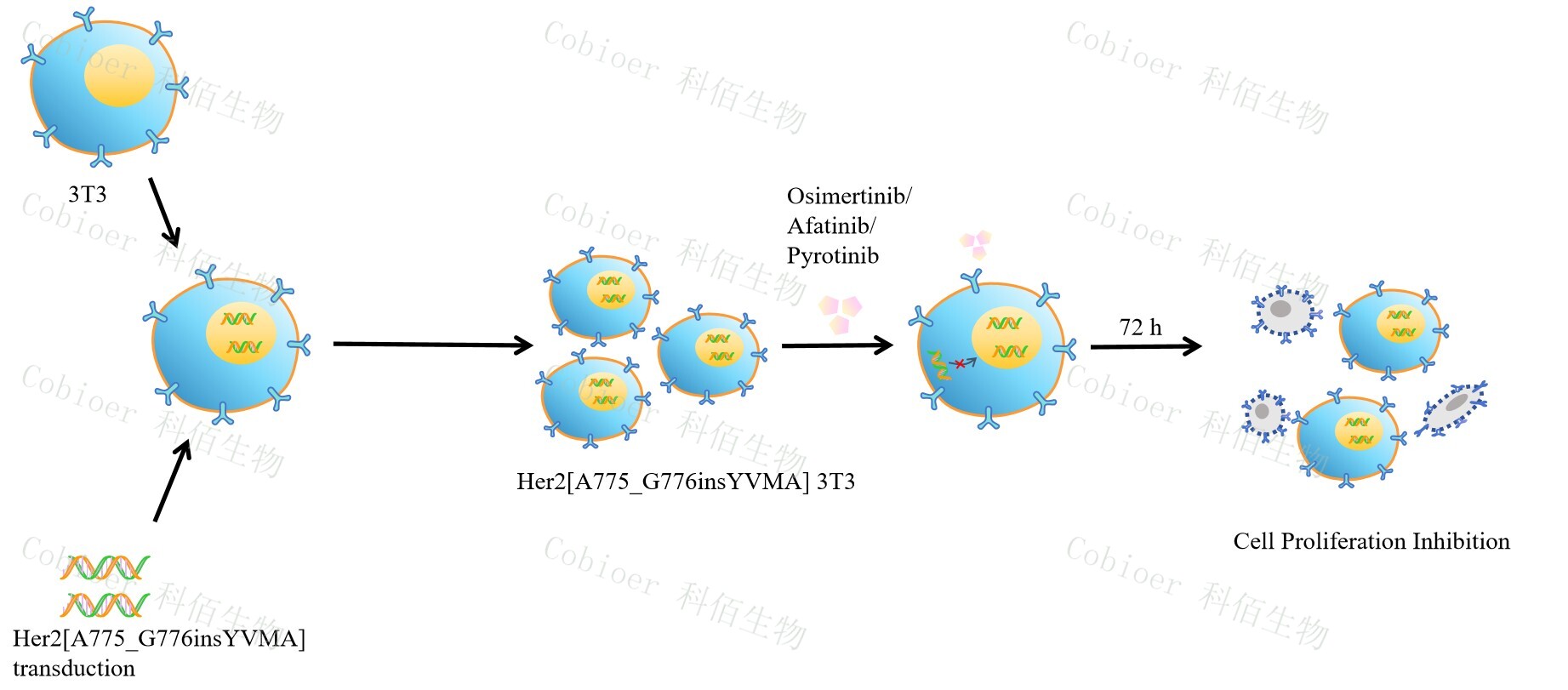 HER2[A775_G776insYVMA] 3T3 藥靶細(xì)胞,通過轉(zhuǎn)導(dǎo)突變狀態(tài)的 HER2[A775_G776insYVMA] 基因到 3T3 細(xì)胞系中 , 穩(wěn)定表達(dá)人突變形態(tài)下的 HER2[A775_G776insYVMA]基因,原理及流程見下圖所示。![]() Figure 1. HER2[A775_G776insYVMA] 3T3 細(xì)胞的構(gòu)建原理圖 |