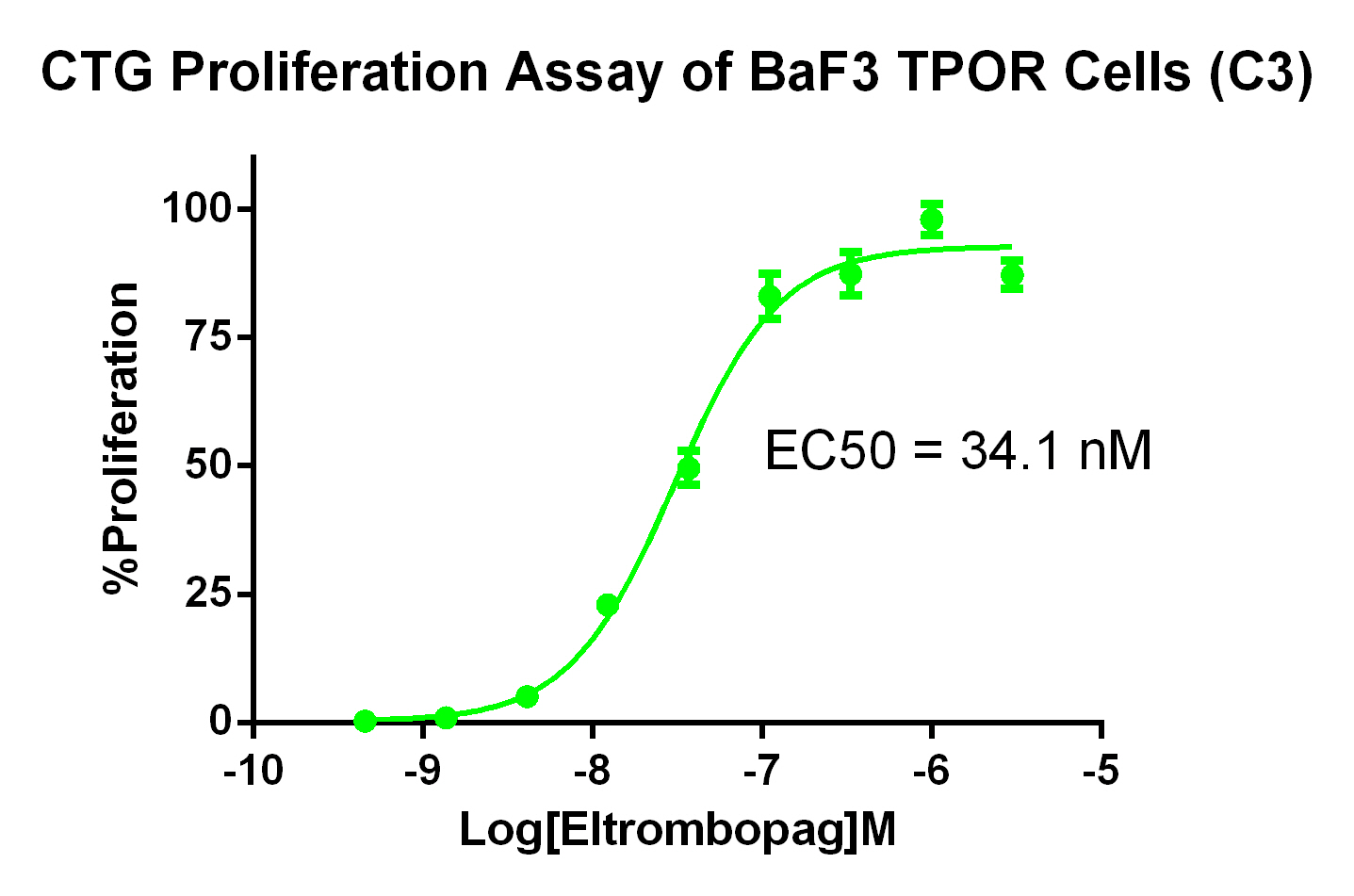 Figure 2. CTG Proliferation Assay of BaF3 TPOR Cells (C3), the EC50=34.1nM. |