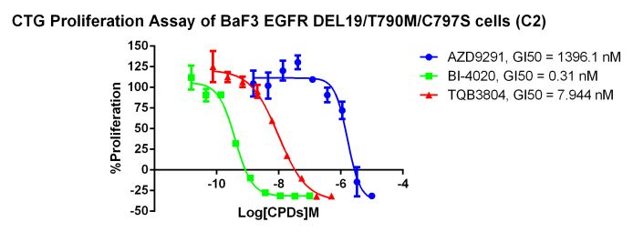 我們結(jié)合自己多年在細(xì)胞領(lǐng)域的豐富經(jīng)驗(yàn),在 Ba/F3(小鼠原B細(xì)胞)上進(jìn)行改造,引入相應(yīng)表達(dá)激酶基因,這些基因能作為Ba/F3的驅(qū)動基因,讓Ba/F3不再依賴IL-3而增殖,進(jìn)而激酶基因成為Ba/F3增殖依賴的驅(qū)動基因,用于評估小分子藥物對激酶的靶向抑制作用。