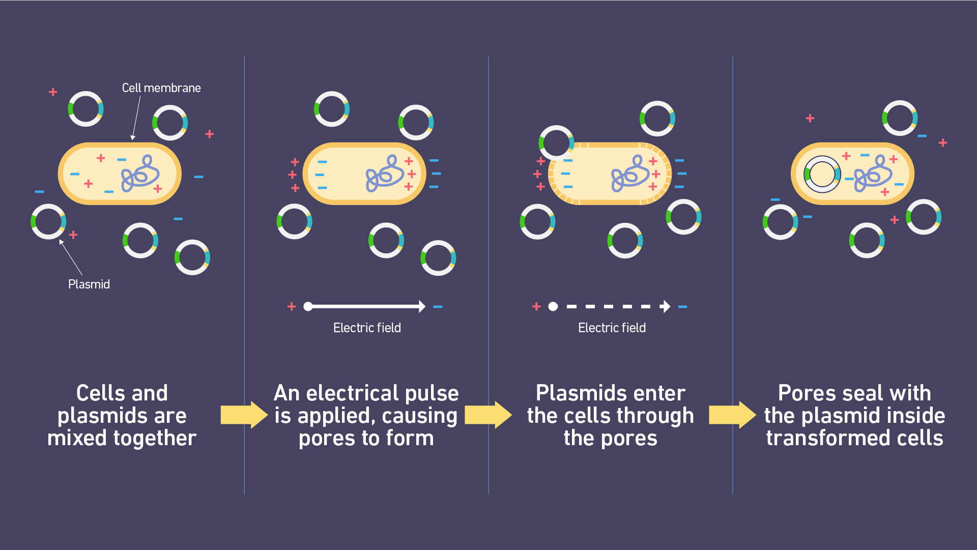 電脈沖擾亂細(xì)胞膜的磷脂雙層,從而形成孔隙(圖 2)。這種過(guò)程是不對(duì)稱的,孔隙首先在細(xì)胞的陽(yáng)極側(cè)形成。同時(shí),跨膜電位增加。這驅(qū)使帶電分子(例如質(zhì)粒DNA)首先吸附到細(xì)胞陰極側(cè)的膜上,然后穿過(guò)這些孔隙進(jìn)入細(xì)胞 (圖 3)。