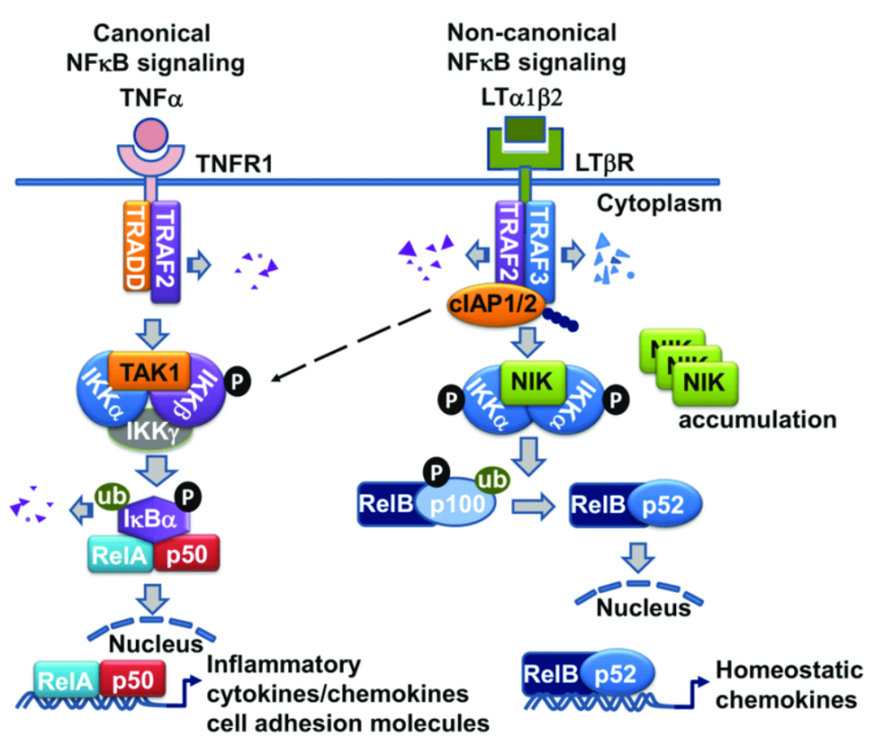 LTBR 信號傳導具有多效性功能,包括控制淋巴器官發(fā)育、由于維持完整的淋巴結(jié)構(gòu)而支持針對病原體的有效免疫反應、誘導三級淋巴結(jié)構(gòu)(LTS)、肝臟再生或控制脂質(zhì)穩(wěn)態(tài)。通過LTBR 的信號傳導包括非經(jīng)典/經(jīng)典NF-κB 途徑,從而誘導趨化因子、細胞因子或粘附分子表達、細胞增殖和細胞存活。LTα1β2與LTβR的結(jié)合啟動TRAF2和TRAF3向LTβR復合物募集,其中TRAF2和TRAF3被cIAP1/2降解,導致NF-κ b誘導激酶(NIK)的穩(wěn)定和積累。NIK與IKKα復合物被激活并導致同二聚體IKKα磷酸化。最終,與RelB結(jié)合的p100前體被切割成p52,并導致RelB-p52異二聚體復合體易位到細胞核,啟動趨化因子基因轉(zhuǎn)錄。LTβR連接還激活IKKα/β磷酸化和RelA/p50核易位,從而導致炎癥和細胞粘附分子的基因轉(zhuǎn)錄。