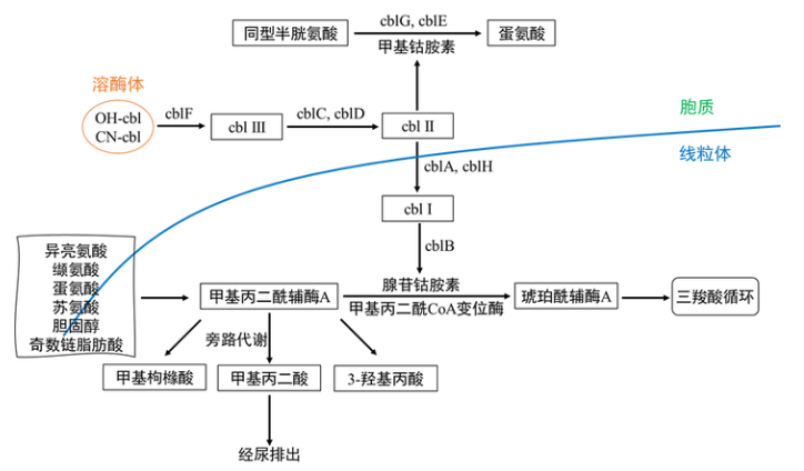 甲基丙二酸是異亮氨酸、纈氨酸、甲硫氨酸、蘇氨酸、膽固醇和奇數(shù)鏈脂肪酸分解代謝途徑中甲基丙二酰輔酶A的代謝產(chǎn)物,正常情況下,在甲基丙二酰輔酶A變位酶及腺苷鈷胺素的作用下轉(zhuǎn)化成琥珀酰輔酶A,參與三羧酸循環(huán)。具體發(fā)病機(jī)制見(jiàn)下圖: