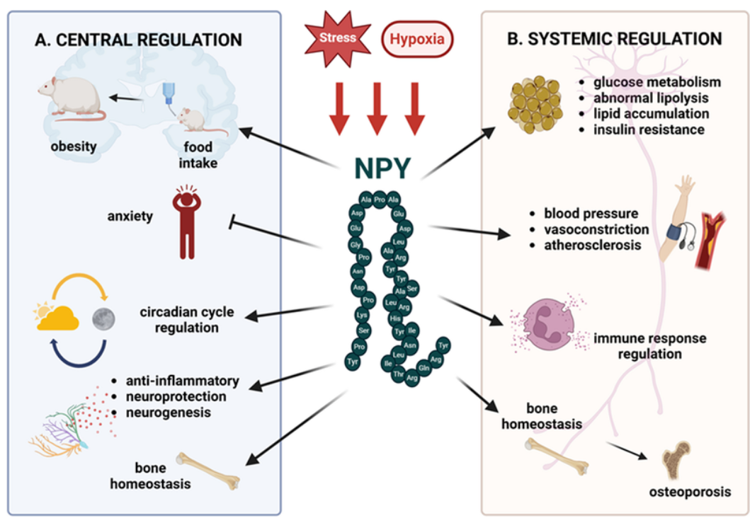 NPY受體被一個結(jié)構(gòu)相關(guān)的富含酪氨酸的多肽家族激活,即NPY(神經(jīng)肽Y),PYY(肽酪氨酸-酪氨酸)和PP(胰腺多肽),它們具有36個氨基酸的共同長度和一個修飾的C段。NPY是中樞和周圍神經(jīng)系統(tǒng)中最豐富的肽之一,在能量穩(wěn)態(tài)中起著重要作用。NPY參與應激反應、食欲刺激、晝夜節(jié)律、免疫和骨骼穩(wěn)態(tài)等過程的中樞調(diào)節(jié)。在外周,NPY與去甲腎上腺素共同從交感神經(jīng)元釋放,影響代謝、心血管系統(tǒng)、骨骼健康和免疫反應。盡管NPY的表達和釋放在很大程度上與交感神經(jīng)系統(tǒng)活性相關(guān),但現(xiàn)在已知幾種細胞對NPY有反應,NPY系統(tǒng)的失調(diào)與幾種病理狀況有關(guān),包括肥胖、心血管疾病、糖尿病和胰島素抵抗,這些狀況也經(jīng)常伴有蛋白尿和CKD。