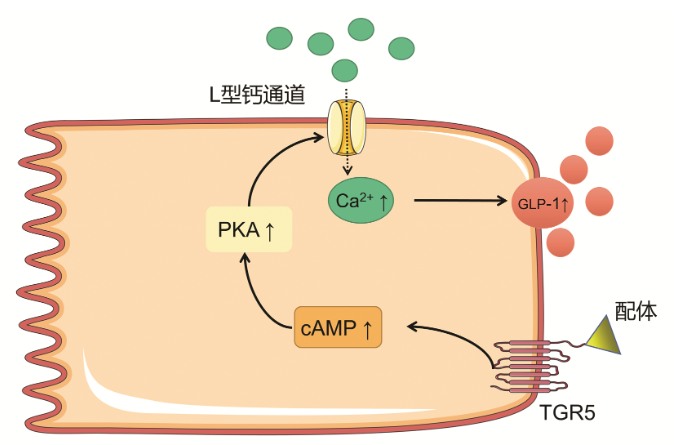 TGR5在維持葡萄糖穩(wěn)態(tài)和胰島素敏感性方面上的效果已得到廣泛證明。例如,使用TGR5激動(dòng)劑6α-乙基-23(S)-甲基-膽酸(6α-ethyl-23(S)-methyl-cholic acid,INT-777)可以提高肥胖小鼠的胰島素敏感性,7-硫酸膽酸以TGR5依賴(lài)性方式增加胰島素抵抗小鼠的葡萄糖耐量等。機(jī)體各組織的TGR5可通過(guò)不同的分子機(jī)制參與血糖代謝的調(diào)節(jié)。TGR5對(duì)于血糖代謝的作用,主要與腸促胰島素釋放相關(guān),通過(guò)刺激腸內(nèi)分泌L細(xì)胞分泌GLP-1來(lái)實(shí)現(xiàn)。既往研究發(fā)現(xiàn),GLP-1可促進(jìn)胰島素分泌,促進(jìn)胰島β細(xì)胞存活和增殖,抑制細(xì)胞凋亡,并且可有效刺激2型糖尿病患者的胰島素分泌并降低血糖。早期觀(guān)點(diǎn)認(rèn)為T(mén)GR5被激活后刺激腸內(nèi)分泌L細(xì)胞內(nèi)cAMP水平增加,線(xiàn)粒體氧化磷酸化增加,ATP/ADP比例增加,導(dǎo)致ATP依賴(lài)性鉀離子通道(KATP)關(guān)閉,開(kāi)放鈣離子通道,促進(jìn)鈣離子內(nèi)流,釋放GLP-1。但后續(xù)大量研究驗(yàn)證了GLP-1的分泌確實(shí)與cAMP升高,胞內(nèi)鈣離子升高有關(guān),但與ATP依賴(lài)性鉀離子通道無(wú)關(guān)。Brighton等的實(shí)驗(yàn)進(jìn)一步驗(yàn)證了GLP-1分泌與L細(xì)胞內(nèi)的cAMP和Ca2+濃度變化有關(guān),并且說(shuō)明了該作用主要由位于基底外側(cè)L細(xì)胞膜上的TGR5介導(dǎo)。近年來(lái),Goldspink等發(fā)現(xiàn)腸L細(xì)胞上的TGR5被激活后,通過(guò)cAMP/PKA途徑,開(kāi)放了L型Ca2+通道,促進(jìn)Ca2+內(nèi)流,引發(fā)GLP-1分泌。