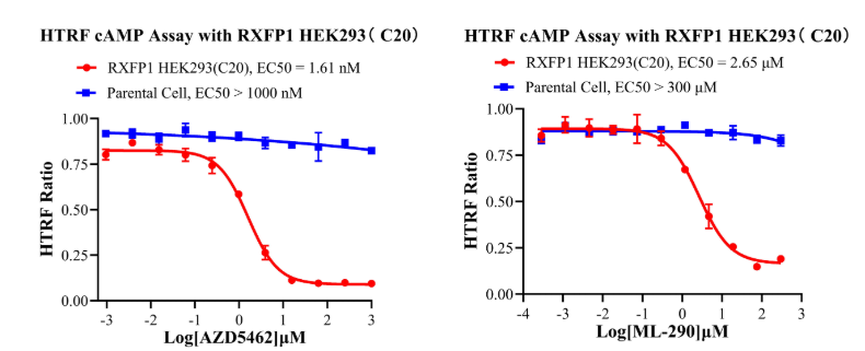 為助力RXFP1靶點藥物研發(fā),南京科佰開發(fā)了RXFP1 CHO、RXFP1 HEK293細胞篩選模型,產(chǎn)品驗證結果如下: