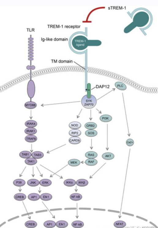 在TREM1被激活后,與其相關(guān)的DAP12蛋白含有ITAMs的胞質(zhì)部分在其酪氨酸殘基上磷酸化,然后與ZAP70和SYK蛋白結(jié)合,使其磷酸化。SYK促進(jìn)包含Cbl、SOS和GRB2的適應(yīng)性復(fù)合物的招募和酪氨酸磷酸化,從而通過(guò)PI3K、PLC-Gamma和ERK途徑導(dǎo)致下游信號(hào)轉(zhuǎn)導(dǎo)。這些途徑誘導(dǎo)Ca2 +動(dòng)員,重新排列肌動(dòng)蛋白細(xì)胞骨架和激活轉(zhuǎn)錄因子,如Elk1、NFA、AP1、c-Fos、c-Jun和Nf-κB,這些轉(zhuǎn)錄因子編碼促炎癥細(xì)胞因子、趨化因子和細(xì)胞表面分子。此外,TREM1誘導(dǎo)的PI3K和ERK途徑的激活可以通過(guò)滅活促凋亡因子來(lái)促進(jìn)線粒體的完整性和細(xì)胞生存:BID、BAD和BAX,并抑制CytoC從線粒體釋放。