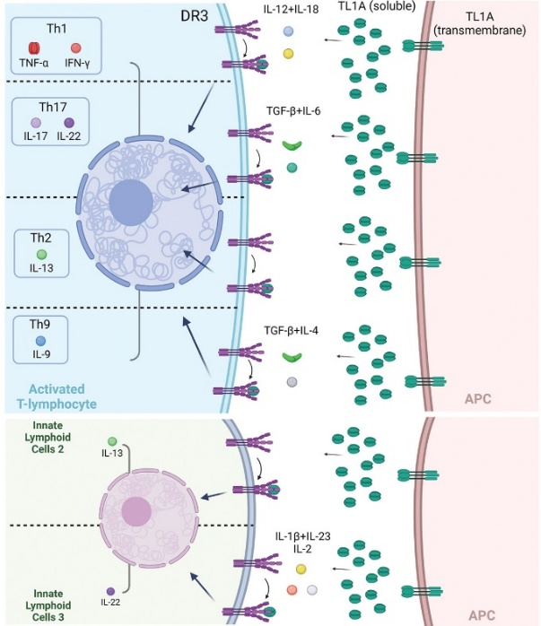 TL1A/DR3信號的下游作用包括產(chǎn)生幾種關(guān)鍵的因子,如IFN-γ、TNF-α、IL-6和IL-17,以及IL-2、IL-4、IL-13,這些促炎因子表達(dá)上調(diào),并可能產(chǎn)生致病作用。