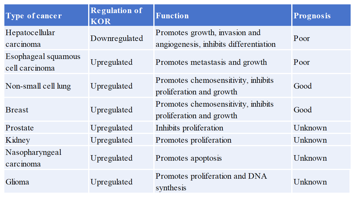 阿片類藥物是最有效的鎮(zhèn)痛藥,已廣泛用作治療疼痛和相關(guān)疾病的治療藥物。除了疼痛,阿片類藥物還經(jīng)常用于治療許多其他疾病包括腹瀉、咳嗽、術(shù)后疼痛和癌癥。有報(bào)道指出KOR可能與幾種癌癥的預(yù)后有關(guān),如下圖所示: