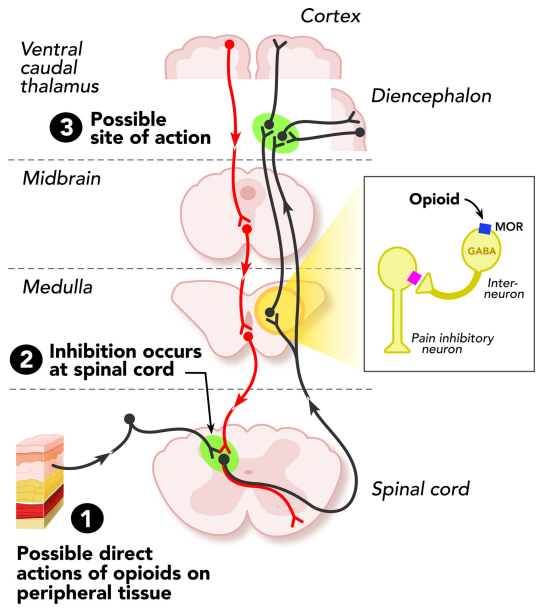 阿片受體在這些部位的激活位置直接抑制神經(jīng)元,進(jìn)而抑制脊髓疼痛的傳遞。這些受體參與去抑制的過程傳導(dǎo)至神經(jīng)元將有害刺激轉(zhuǎn)化為動(dòng)作電位并傳導(dǎo)到脊髓。從傷害感受器傳遞信息到上升的脊髓神經(jīng)元,然后再到大腦通過單突觸接觸和/或通過中間神經(jīng)元進(jìn)行調(diào)節(jié)。被激動(dòng)劑激活后,如內(nèi)源性μ-阿片肽(Endorphin),或外源性激動(dòng)劑如嗎啡(Morphine)和芬太尼(Fentanyl)的Gα和Gβγ亞基彼此分離并隨后作用于各種細(xì)胞內(nèi)效應(yīng)物通路。