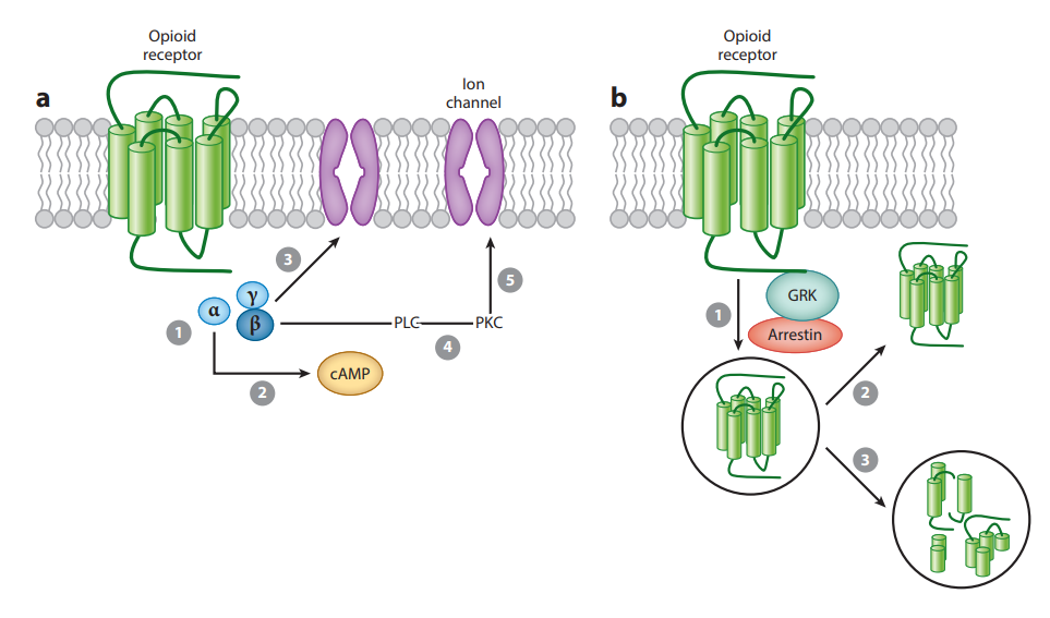 早期阿片受體藥理學(xué)研究表明,鳥嘌呤三磷酸鳥苷(GTP)等核苷酸調(diào)節(jié)激動(dòng)劑與腦組織膜制劑中的阿片受體結(jié)合。后來(lái)確定GTPase活性由阿片激動(dòng)劑和內(nèi)源性阿片肽調(diào)節(jié)。激動(dòng)劑刺激阿片受體抑制環(huán)腺苷一磷酸(AMP)的產(chǎn)生方式與其他類型的g蛋白偶聯(lián)受體(GPCR)相似。阿片受體對(duì)cAMP信號(hào)的抑制通路屬于Gαi依賴,即阿片受體和激動(dòng)劑結(jié)合時(shí)會(huì)抑制cAMP的形成。四個(gè)阿片受體具有相似的信號(hào)通路,每個(gè)阿片受體上的選擇性配體結(jié)合阿片受體后可引起cAMP形成抑制,MAPK信號(hào)通路激活,或者Arrestin招募,蛋白內(nèi)化等。