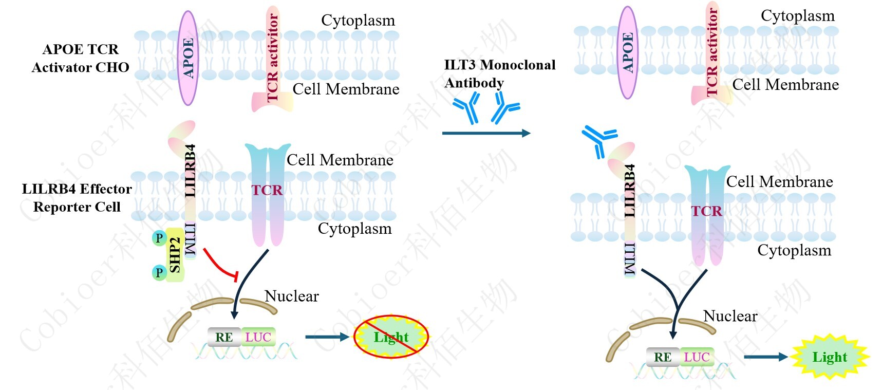 APOE TCR Activator CHO 作為 LILRB4 Effector Reporter Cell 的靶細胞,很好的模擬了 體內(nèi) LILRB4 的信號轉(zhuǎn)導過程,原理見下圖所示。![]() Figure 1. APOE TCR Activator CHO 模型原理圖 |