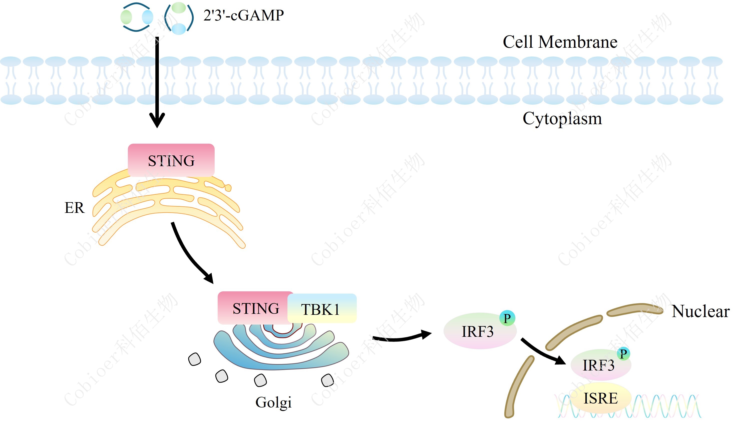 ISRE-Luc RAW264.7 報(bào)告基因細(xì)胞是由 ISRE 調(diào)控并表達(dá) Luc 熒光素 酶報(bào)告基因的 RAW264.7細(xì)胞。RAW264.7 是小鼠巨噬細(xì)胞的常用模型,用于研究細(xì)胞對(duì)微 生物及其產(chǎn)物的反應(yīng)。RAW 264.7 衍生細(xì)胞內(nèi)源性表達(dá)許多 PRR,包括 toll 樣受體 (TLR)、 NOD 樣受體 (NLR)、RIG-I 樣受體 (RLR) 和 C 型凝集素受體 (CLR)。STING 激活的 原理見下圖所示。