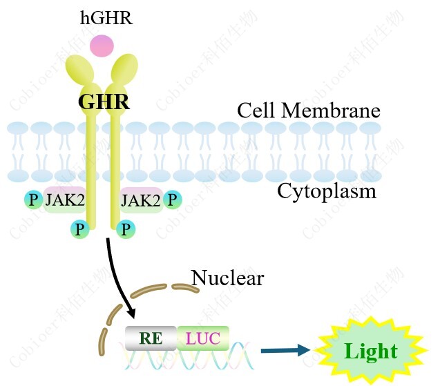 GHR Effector Reporter Cell 報(bào)告基因藥靶模型很好的模擬了體內(nèi) GHR 的信號(hào)轉(zhuǎn)導(dǎo)過(guò)程, 原理見(jiàn)下圖所示。![]() Figure 1. : GHR Effector Reporter Cell 細(xì)胞模型原理圖 |