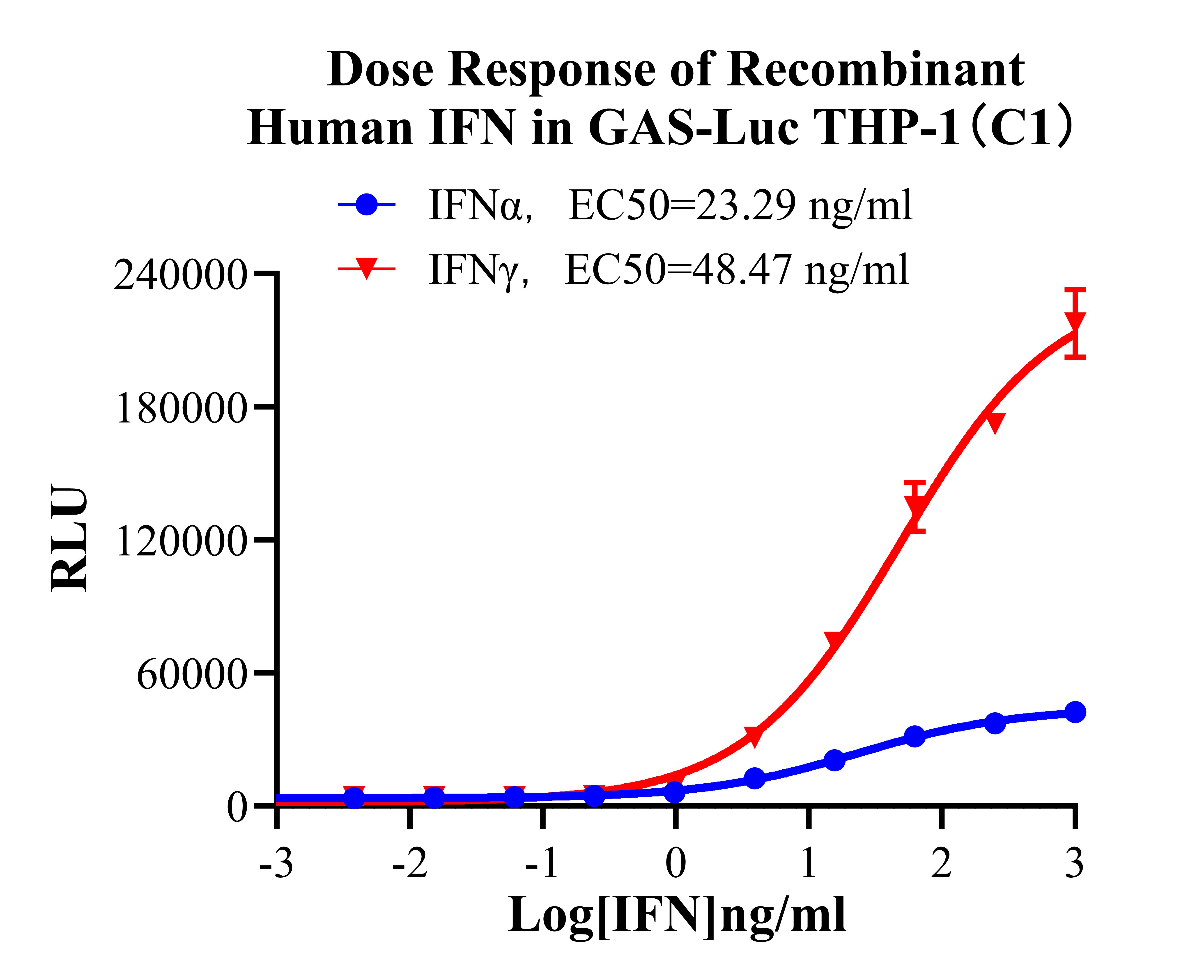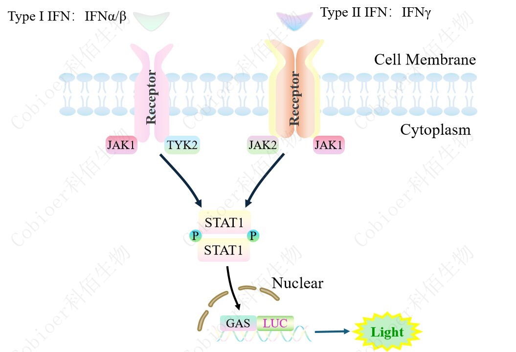 GAS-Luc THP-1 報(bào)告基因細(xì)胞,是由 GAS 調(diào)控并表達(dá) Luc 熒光素酶報(bào)告基因的 THP-1 細(xì)胞。IFN 與受體結(jié)合,激活 GAS 的原理見下圖所示。