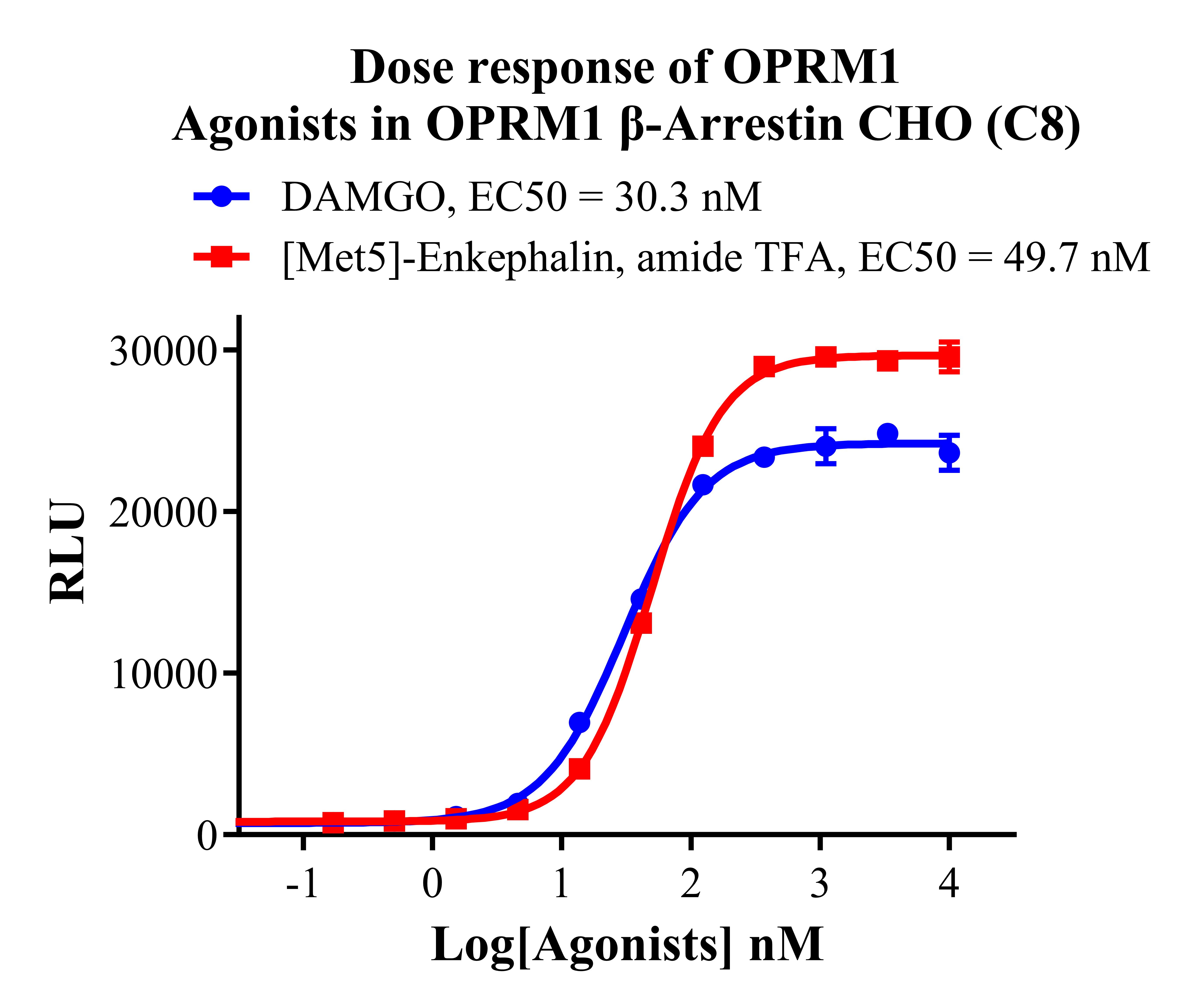 OPRM1 β-Arrestin CHO 報(bào)告基因藥靶模型很好的模擬了體內(nèi) OPRM1/β-Arrestin 的信號(hào) 轉(zhuǎn)導(dǎo)過程,原理見下圖所示。當(dāng)缺乏配體刺激時(shí),β-Arrestin 不與 OPRM1 結(jié)合,融合β- Arrestin 的熒光素酶處于失活構(gòu)象,當(dāng) OPRM1 遭遇配體刺激時(shí),融合熒光素酶報(bào)告基因的 β-Arrestin 被招募,使熒光素酶報(bào)告基因處于激活狀態(tài),加入其底物后發(fā)光信號(hào)增強(qiáng)。 |