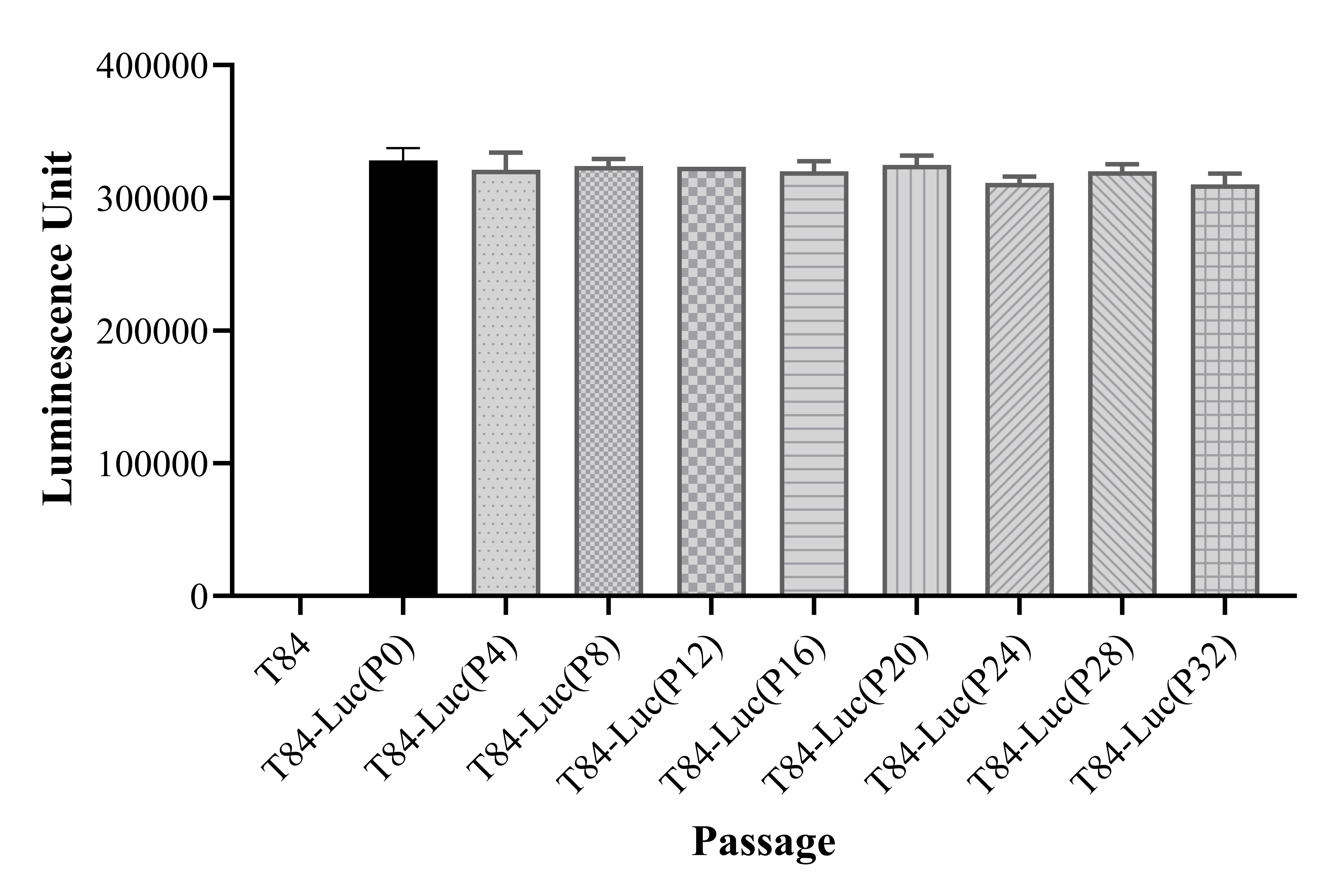Figure 1. Stablity test results. T84-Luc showed at least 32 passage stability with similar luminescence unit.