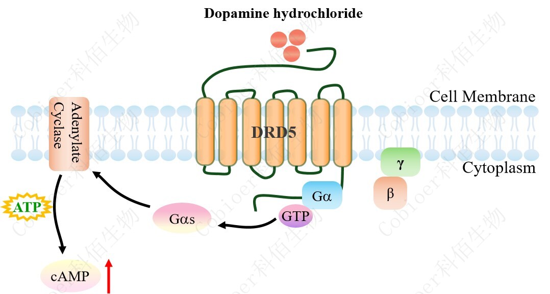 cAMP 在 G 蛋白偶聯(lián)受體(GPCR)信號轉(zhuǎn)導(dǎo)中是一種關(guān)鍵的第二信使。當(dāng)配體結(jié)合 到 GPCR,構(gòu)象發(fā)生變化,激活受體接著激活 G 蛋白,Gs 的激活導(dǎo)致腺苷酸環(huán)化酶調(diào)控 cAMP 的升高。DRD5 CHO 藥靶模型很好的模擬了體內(nèi) DRD5 的信號轉(zhuǎn)導(dǎo)過程,原理見下圖所 示。