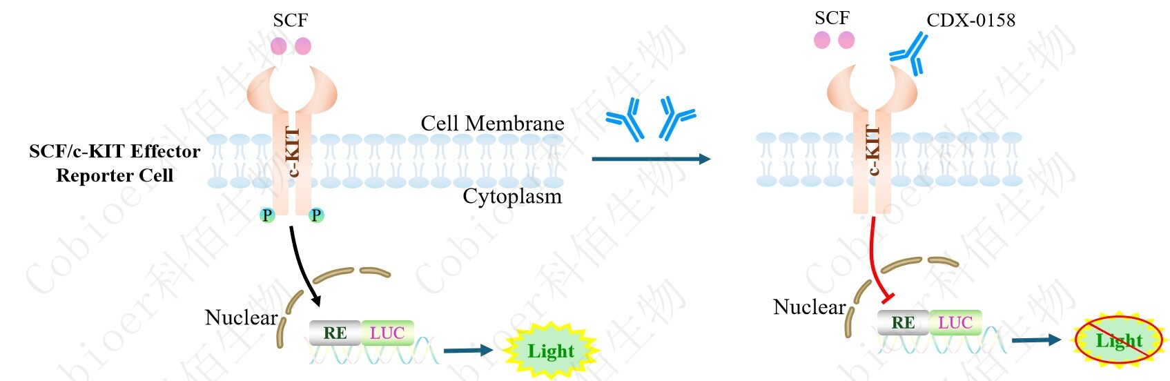 SCF/c-KIT Effector Reporter Cell 報(bào)告基因藥靶模型很好的模擬了體內(nèi) SCF/c-KIT 的信號(hào)轉(zhuǎn)導(dǎo)過(guò)程,原理見(jiàn)下圖所示。