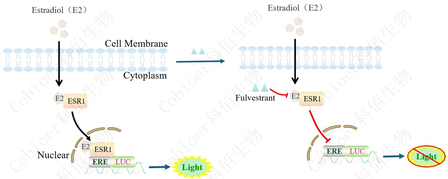 ESR1 ERE-Luc Hela Cell,是由 ERE 調(diào)控并表達(dá) Luc 熒光素酶報(bào)告基因 的 Hela 細(xì)胞。β-雌二醇(17β-Estradiol,E2)是人體內(nèi)活性最強(qiáng)的雌激素,主要通過結(jié)合 ER 發(fā)揮作用,調(diào)控基因表達(dá)和細(xì)胞功能,原理見下圖所示。![]() Figure 1. ESR1 ERE-Luc Hela Cell 原理示意圖 |