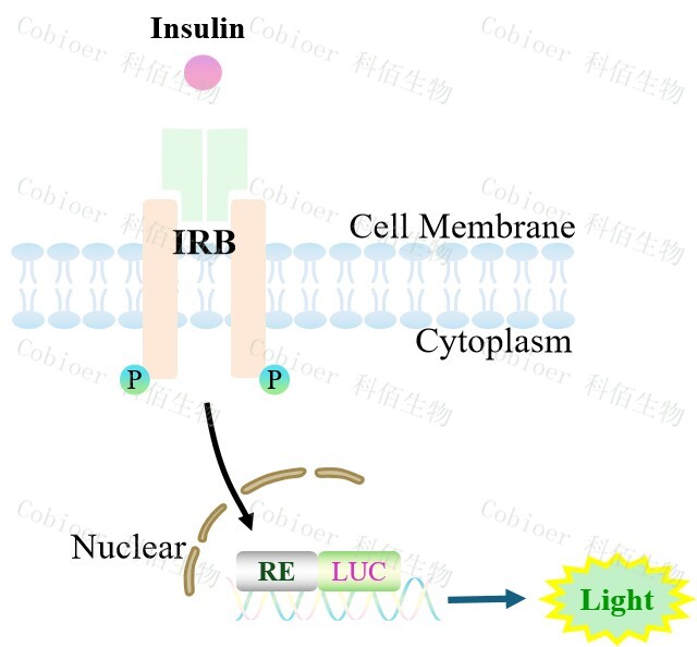 IRB Effector Reporter Cell 報告基因藥靶模型很好的模擬了體內 Insulin 的信號轉導過程, 原理見下圖所示。