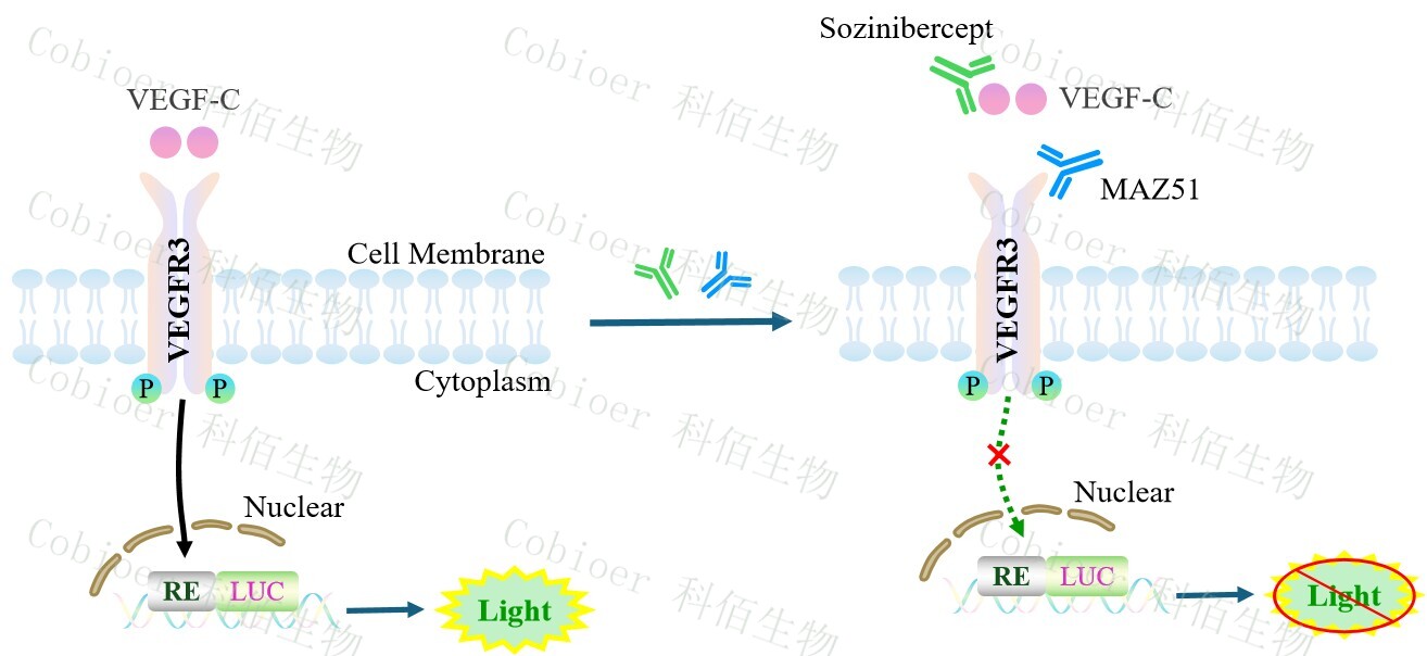 VEGFC/VEGFR3 Effector Reporter Cell 報(bào)告基因藥靶模型很好的模擬了體內(nèi) VEGFC/VEGFR3 的信號(hào)轉(zhuǎn)導(dǎo)過(guò)程,原理見下圖所示。![]() Figure 1. VEGFC/VEGFR3 Effector Reporter Cell 細(xì)胞模型原理圖 |