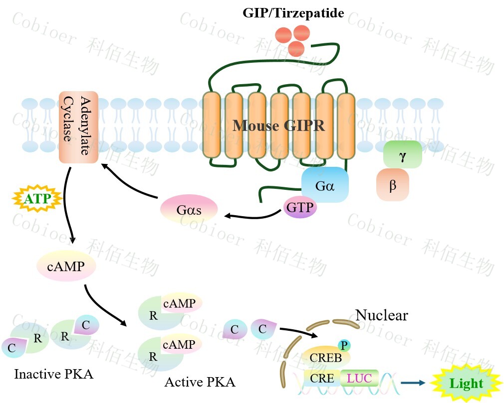Mouse GIPR CRE-Luc HEK293 報告基因藥靶模型很好的模擬了體內 GIPR 的信號轉導過程,原理見下圖所示。